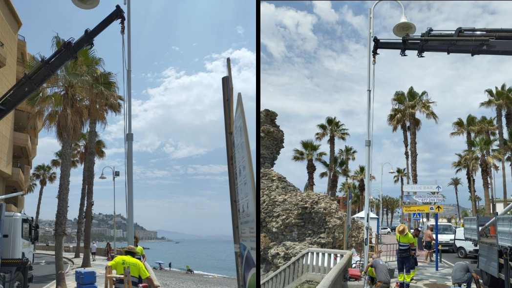 El Ayuntamiento de Almuñécar ha iniciado esta semana el cambio de una decena de báculos de farolas y 19 luminarias del paseo Prieto Moreno – Caletilla ante el deterioro sufrido por los efectos marinos, al tiempo que supondrá un importante ahorro en el consumo al ser las nuevas lámparas de led, según ha informado el concejal delegado de Mantenimiento y Obras, Francisco Rodríguez