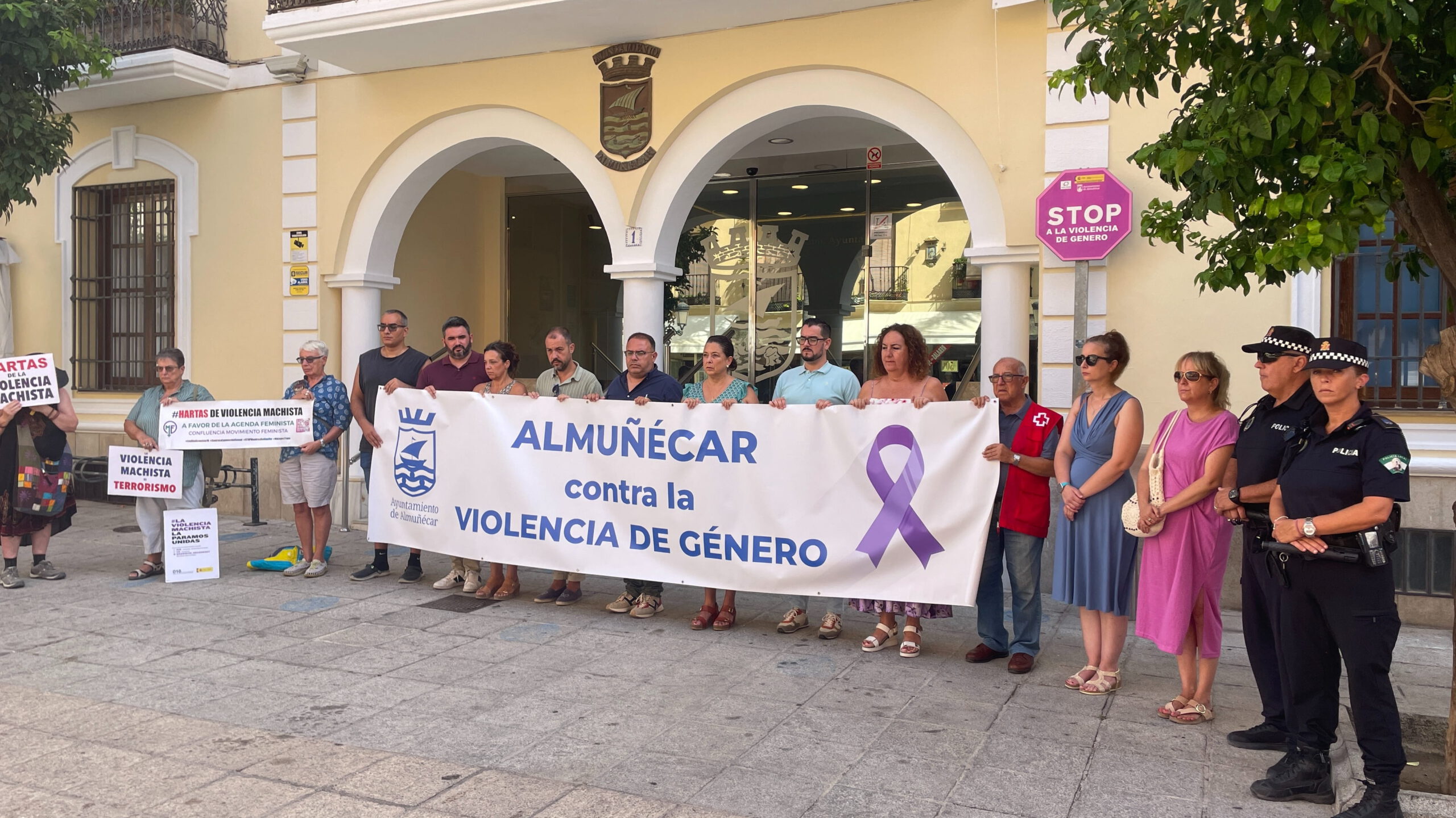 El Ayuntamiento de Almuñécar, sito en la plaza de la Constitución, ha sido testigo de la concentración silenciosa, solo rota al final de acto con un sonoro aplauso, a la que han acudido el alcalde, Junajo Ruiz Joya y su equipo de gobierno, la oposición y colectivos como la Policía Local, Cruz Roja y asociaciones de apoyo a mujeres maltratadas.