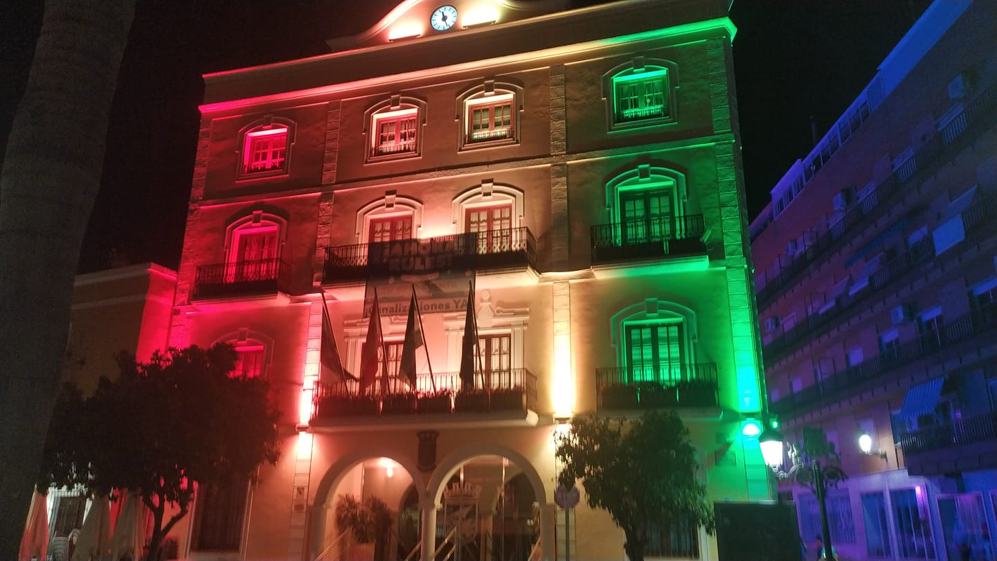 El Ayuntamiento de Almuñécar se suma un año más a la reivindicación de derechos del colectivo LGTBI+ con la iluminación de la fachada del edificio Consistorial, en la plaza de de la Constitución, con los colores de la bandera arcoíris durante el fin de semana y la noche del lunes, 28 de junio, Día Internacional del Orgullo LGTBI+