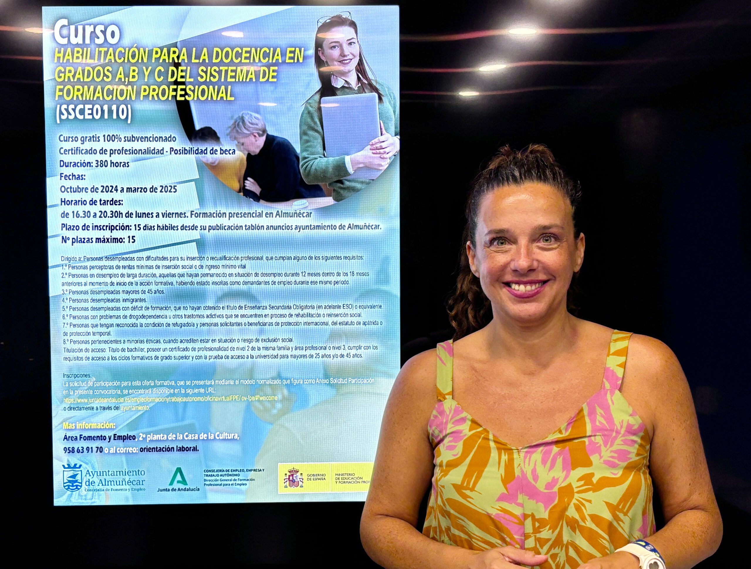 La concejal de Formación y Empleo, Beatriz González, ha informado de que el Ayuntamiento de Almuñécar ha puesto en marcha el certificado de profesionalidad en docencia de la formación profesional para el empleo (SSCE0110), aprovechando el aula homologada del Estadio municipal de deportes ‘Francisco Bonet’ y estará 100% Subvencionado.