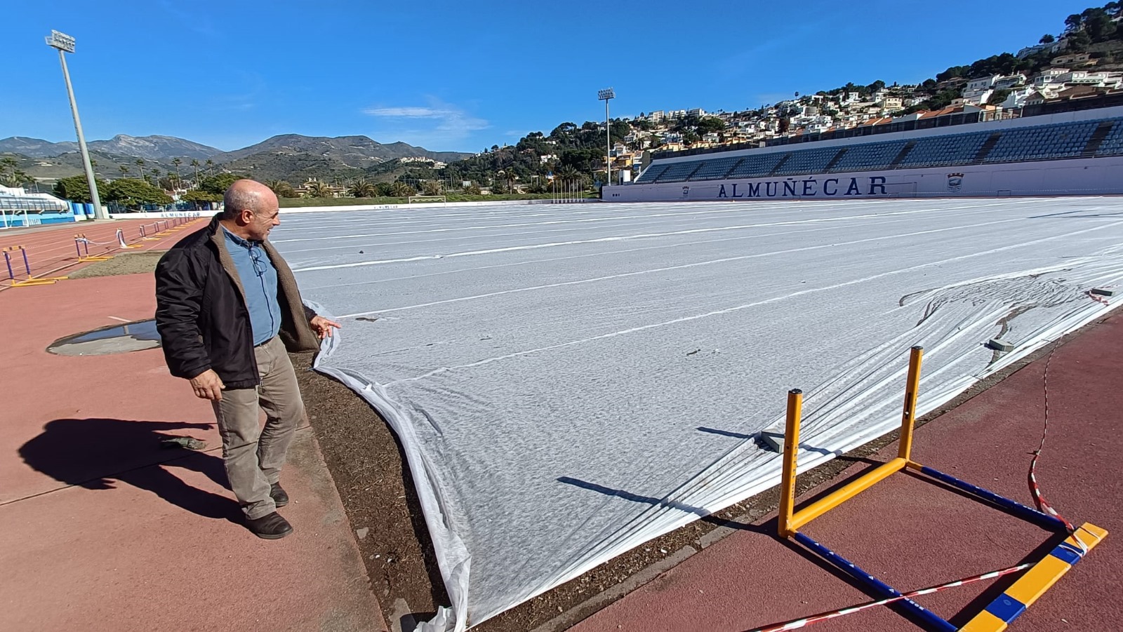 El concejal de Deportes del Ayuntamiento de Almuñécar, Luis Aragón, ha indicado que el campo municipal de fútbol ‘Francisco Bonet’ de Almuñécar se encuentra en plena transformación con la renovación de su césped natural. Desde hace unos días, el terreno está cubierto por una lona especial con el “objetivo de proteger las semillas recién plantadas de aves, como palomas o gaviotas, lo que asegurará un crecimiento óptimo del nuevo césped».