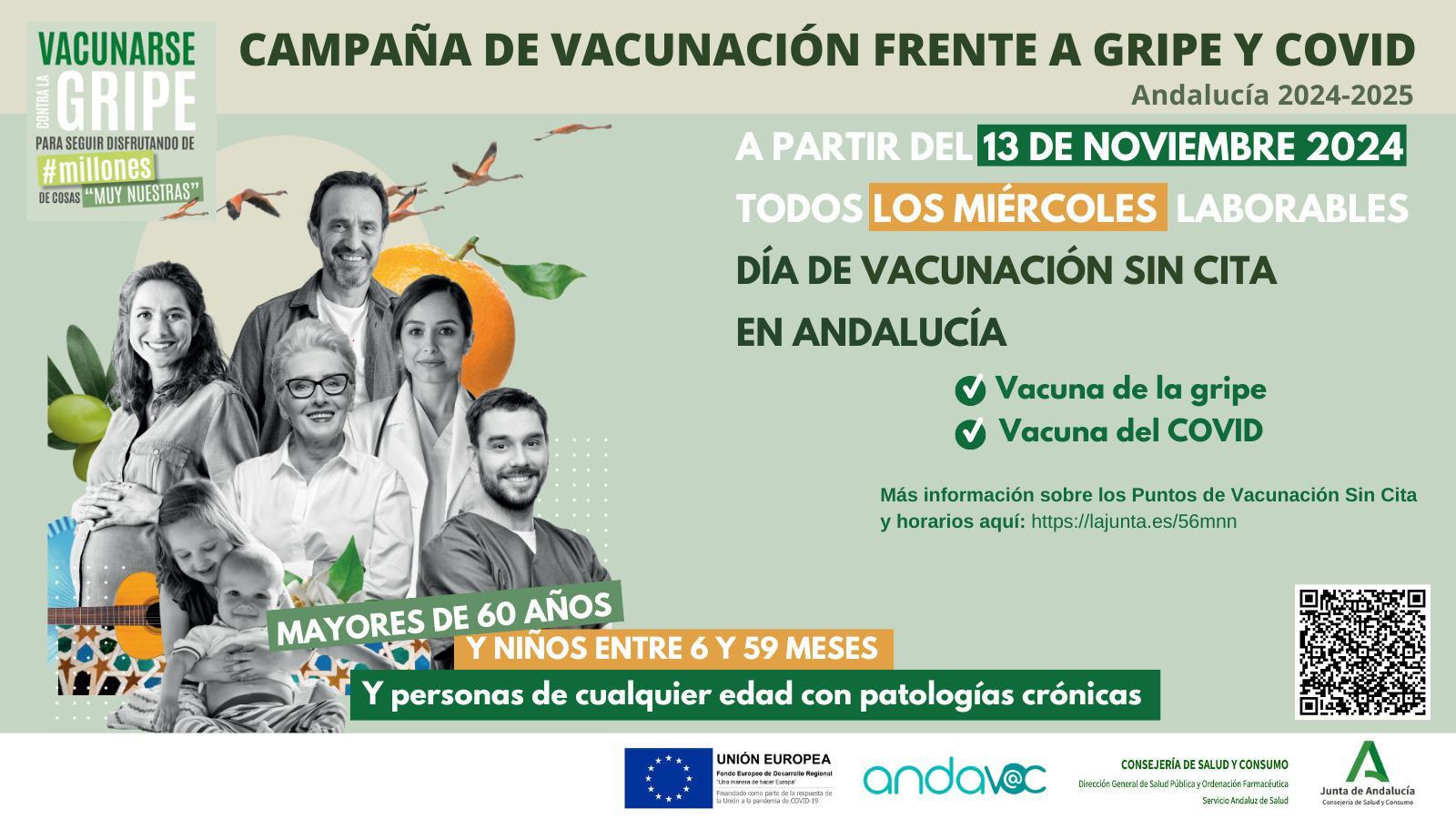 La Consejería de Salud y Consumo, a través de la Dirección General de Salud Pública y Ordenación Farmacéutica y el Servicio Andaluz de Salud, comenzará a vacunar sin cita a la población diana todos los miércoles a partir del día 13 en los 623 puntos habilitados, de los cuales 212 puntos incluyen horario de tarde. Ese día, además, comienza la vacunación para el último de los grupos de riesgo incluidos en la campaña 2024-2025, de este modo, podrán vacunarse también los convivientes en el hogar con personas de 60 años o más, enfermos crónicos, embarazadas y puérperas; y las personas fumadoras.