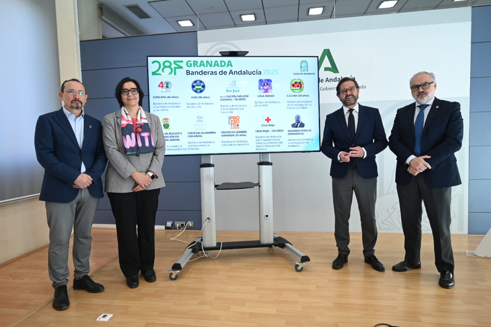 El delegado del Gobierno, Antonio Granados, ha dado a conocer hoy a las personas y entidades que este año recibirán una bandera andaluza en el acto institucional organizado para el próximo viernes, día 21, en el Parque de las Ciencias, con el que la Junta celebra en Granada el Día de Andalucía. Entre los galardonados de este año se encuentran Cervezas Alhambra, Cruz Roja, el O61 y Lola Índigo, entre otros.