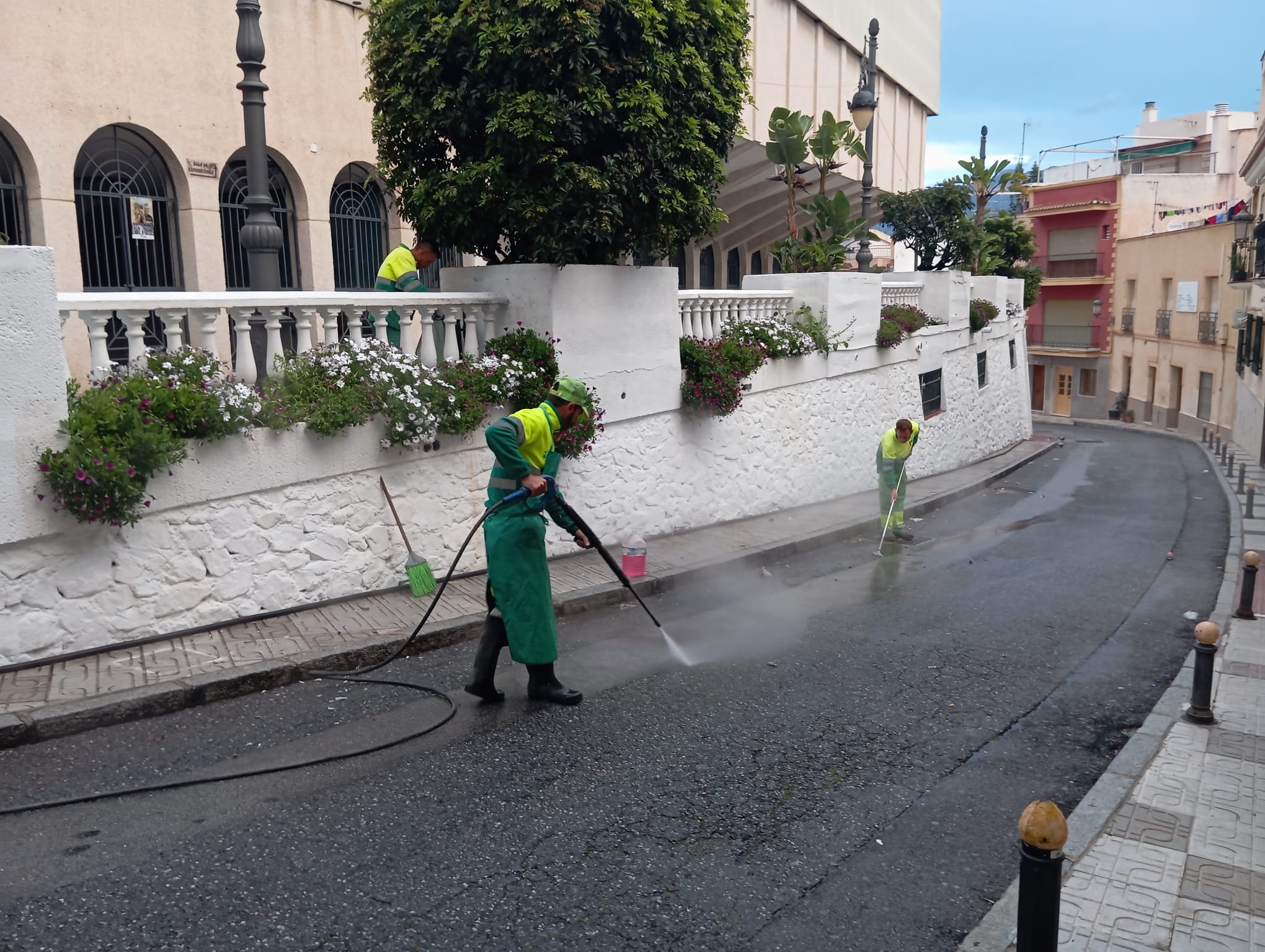 Desde el lunes a primera hora de la mañana los empleados del servicio de limpieza de Almuñécar vienen realizando una intensa labor para retirar de la vía pública la cera de las velas derramada por el paso de los desfiles procesionales de la Semana Santa y así evitar los accidentes tanto de vehículos como de peatones.