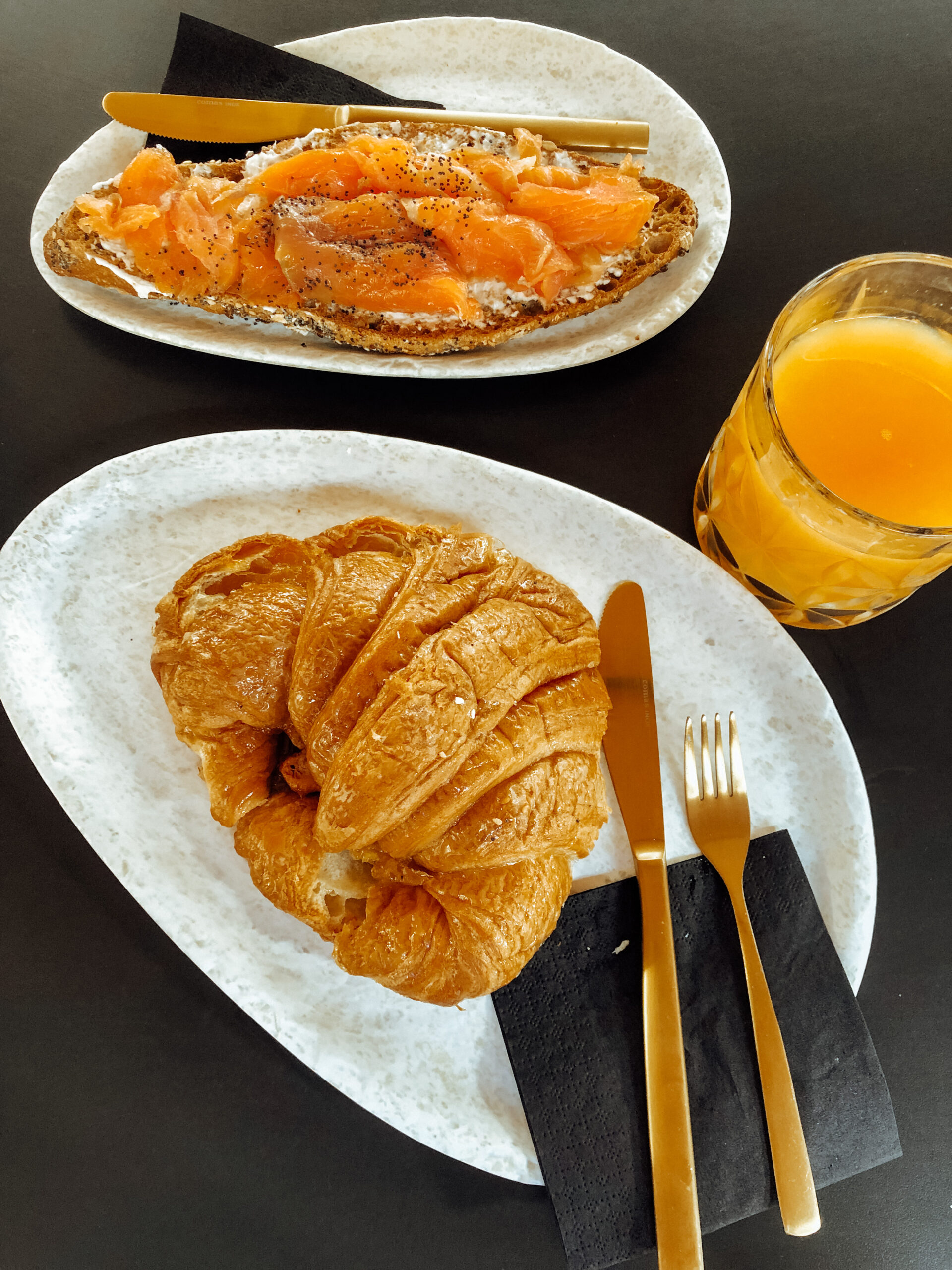 Para beber, optamos por un zumo de naranja natural y un café capuccino con crema de leche. Y para coger fuerzas a primera hora de la mañana, lo acompañamos de una tostada de salmón con crema de queso y un exquisito croissant con mermelada de vainilla y calabaza. Sentimos repetirnos, pero tenemos que recordarte que todo es casero, incluida la mermelada. Nunca antes habíamos probado alguna parecida (aunque una imagen vale más que mil palabras, ojalá pudiéramos acercaros algo de su sabor). Otras veces también hemos probado el capuccino con nata y la tostada de jamón serrano y queso. No hay nada que no nos haya gustado.