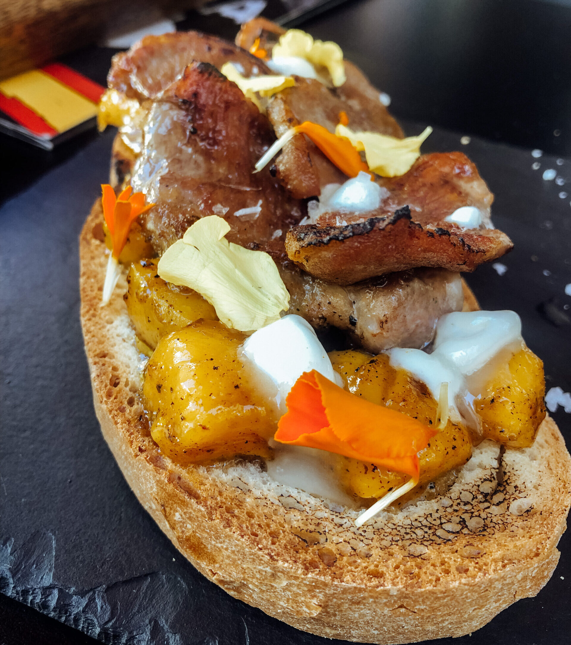 Tanto nos gustó esta última que ni nos acordamos de hacer foto en su momento, así que en nuestra visita más reciente íbamos decididos a saborearla de nuevo. Hasta que nos comentaron las opciones fuera de carta y entonces se hizo la magia: tosta en pan de pueblo de secreto y mango flambeado con queso de cabra. Nunca nos imaginamos que estos tres ingredientes hicieran tan buena liga. Desde nuestra humilde posición nos gustaría hacer un llamamiento: ¡que se incluya en el menú hasta el final de los días, por favor!