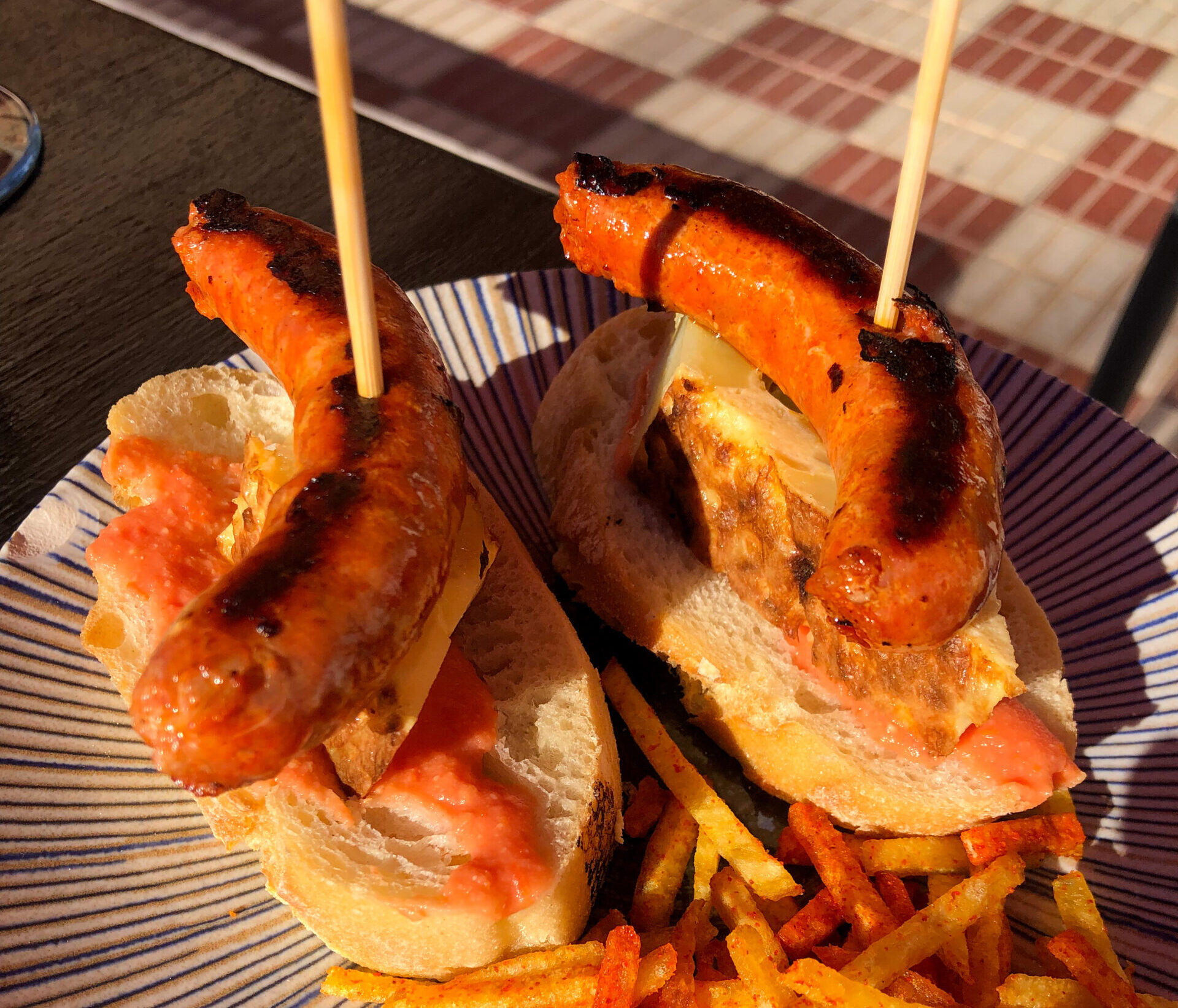 Sus tapas no se pueden elegir pero eso no supondrá ningún problema. Allí hemos probado el rollito de atún con mahonesa y mermelada, que sorprende al paladar por su sabor tan distinto. Si acudes al medio día probablemente tengas la suerte de probar la paella en cazuelita. En tercer lugar, un pinchito de pollo con verdura. Por último, y para nuestra sorpresa, hemos terminado con un pincho de tortilla sobre salmorejo acompañado por longaniza.