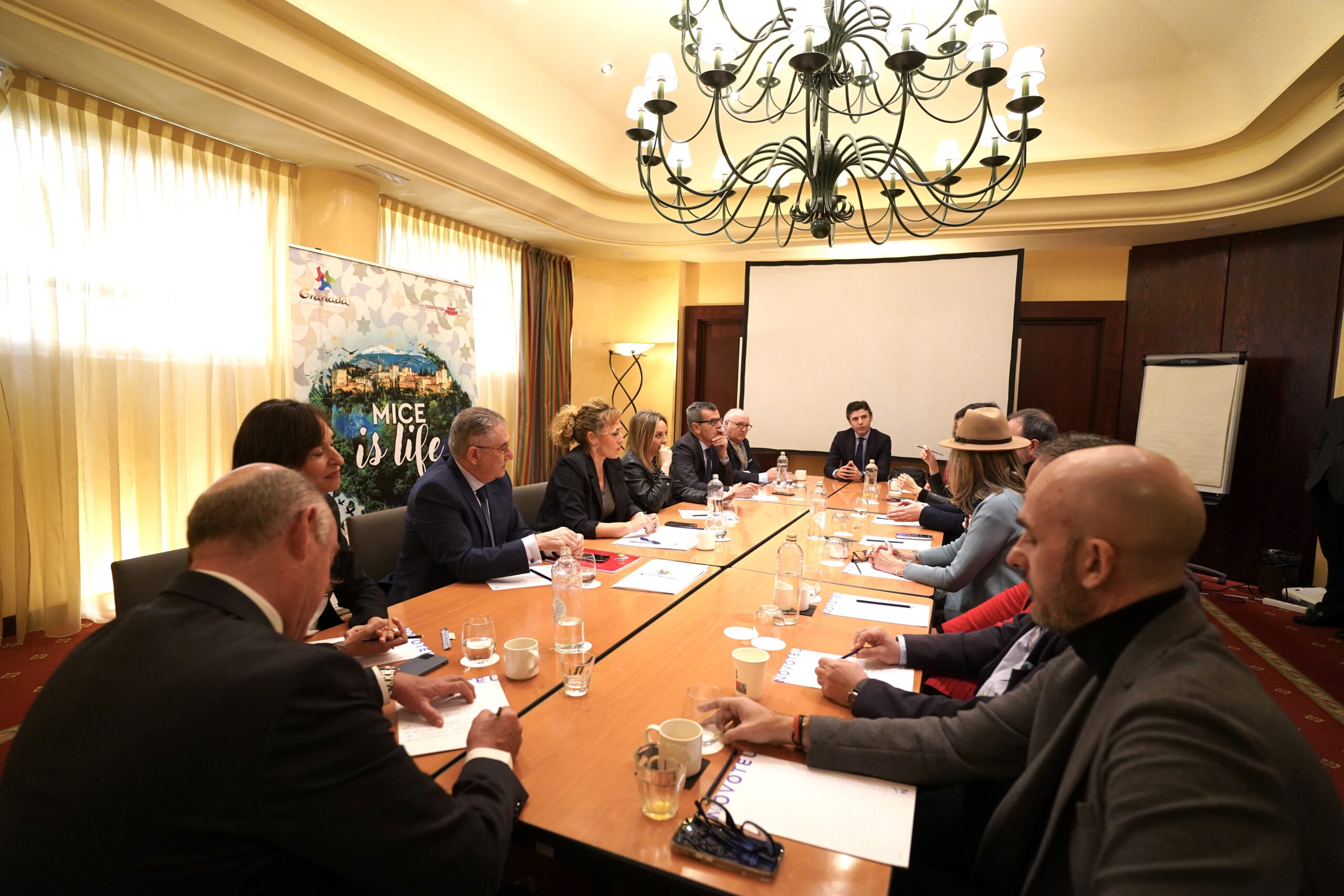 La diputada de Turismo, Marta Nievas, junto a la alcaldesa de Granada, Marifrán Carazo, el concejal de Turismo de la capital, Juan Ramón Ferreira, la directora del Convention Bureau, Eva Garde, el director general del Patronato Provincial de Turismo, Manuel Muñoz, y el presidente de la Federación de Empresarios y Hosteleros de Granada, Gregorio García, ha participado en un desayuno de trabajo para analizar las posibilidades de la provincia como destino de calidad para empresas organizadoras de Congresos, Eventos, Reuniones y Viajes de Incentivo (MICE).