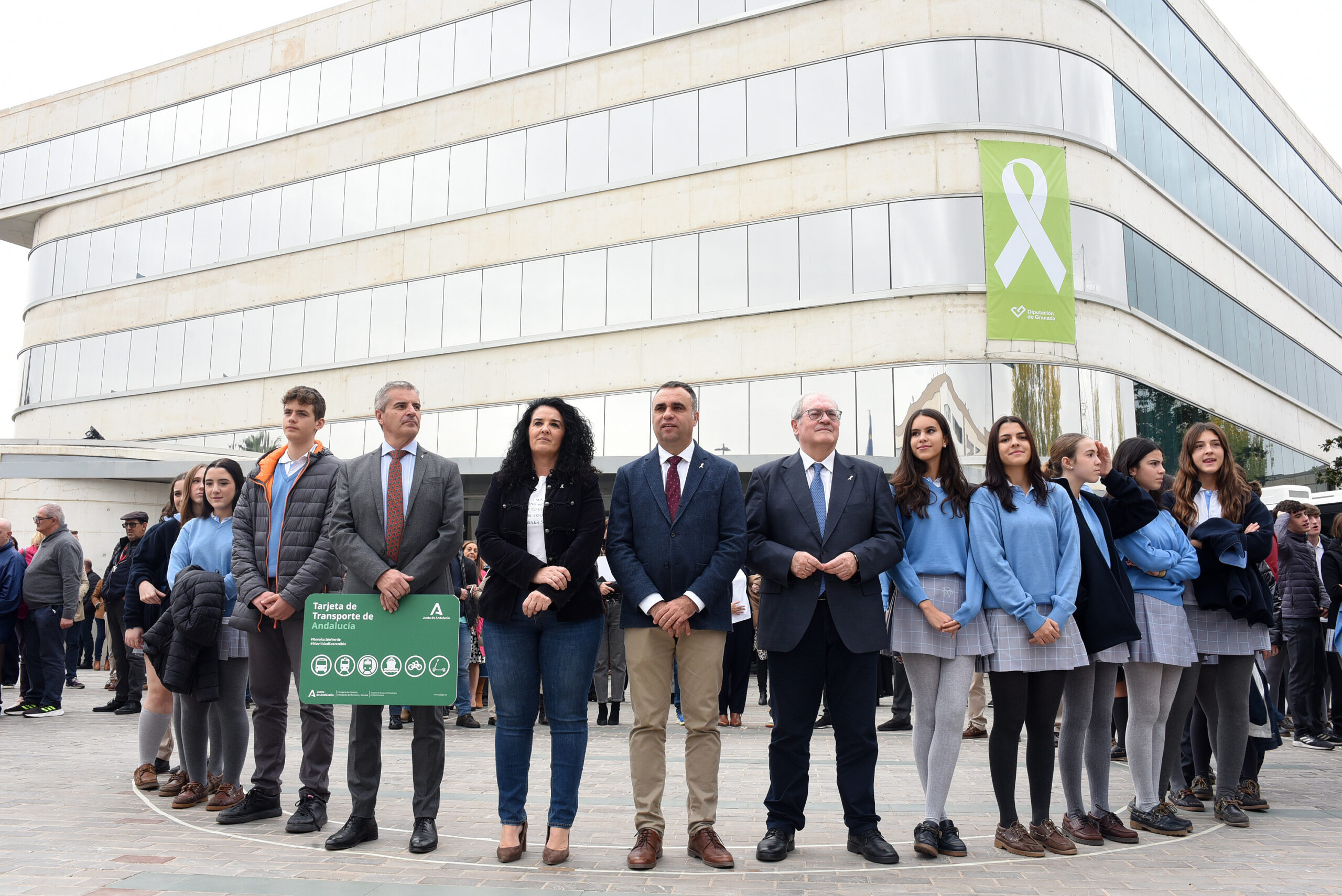 El presidente de la Diputación de Granada, Francis Rodríguez, junto a la diputada de Bienestar Social, Igualdad y Familia, Elena Duque, el director del Consorcio Metropolitano de Transportes, César Díaz, y el delegado territorial de Fomento, Articulación del Territorio y Vivienda de la Junta de Andalucía en Granada, Antonio Ayllón, ha presidido los actos celebrados por la institución provincial con motivo del Día Internacional de la Eliminación de la Violencia contra la Mujer. En el evento conmemorativo han participado más de un centenar de escolares y usuarios del Centro Psicopedagógico Reina Sofía que, junto a corporativos y trabajadores de la Diputación, han formado un gran mosaico con el lema “25N”, simbolizando el compromiso de toda la sociedad granadina con la erradicación de esta lacra.