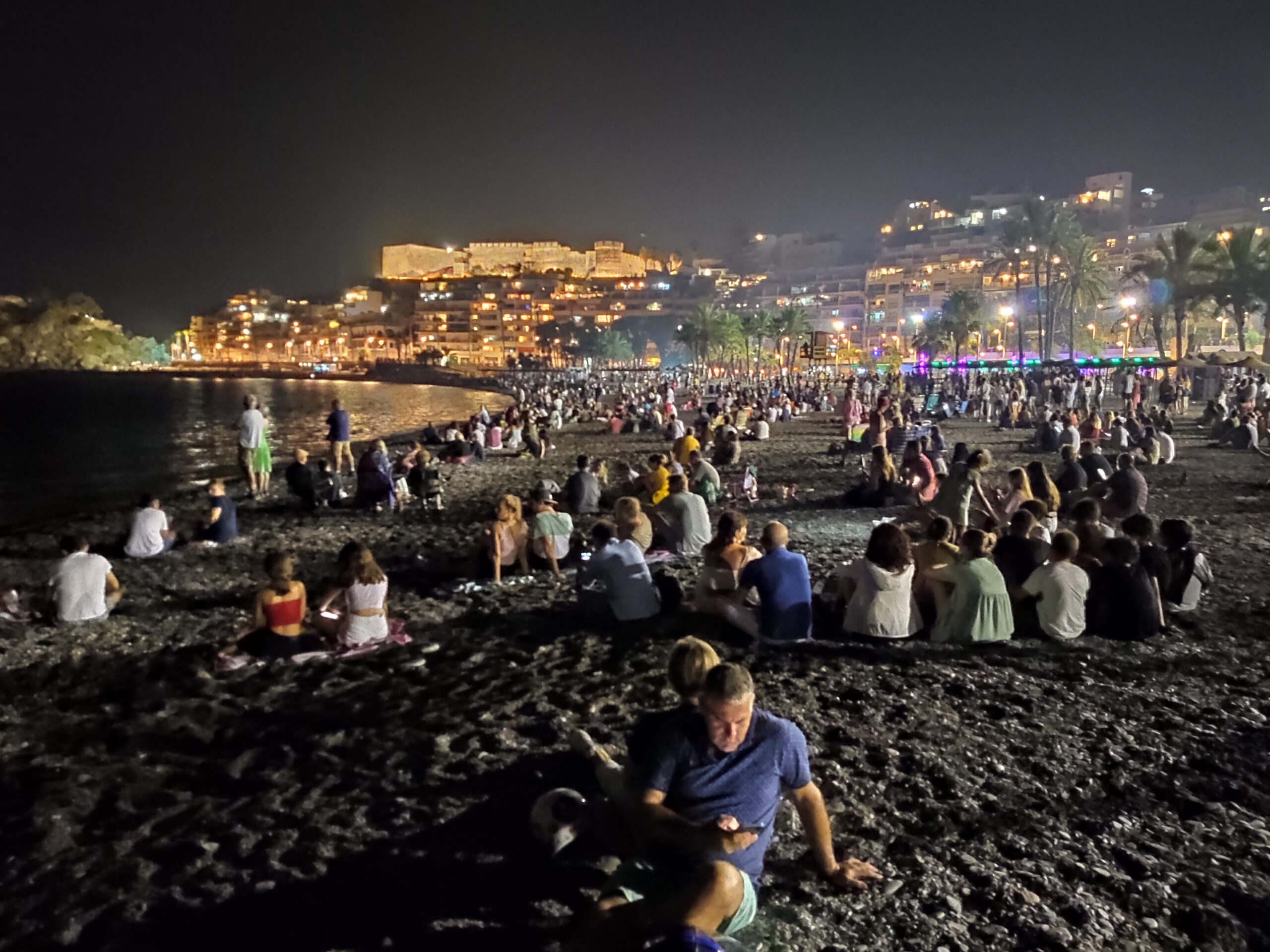 Fueron pocos minutos pero de gran intensidad que arrancaron los aplausos de cientos de personas que encontraban en la playa Puerta del Mar y el Paseo del Altillo. En el mar, decenas de embarcaciones hicieron sonar sus sirenas, e incluso, iluminar con bengalas que se unía a la media luna que destacaba en la noche cerrada. Embarcaciones que aguardaron más de una hora frente a la playa Puerta del Mar para ver momentos espectaculares.