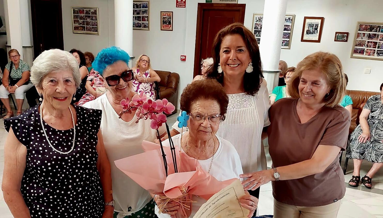 Maria Teresa García González, Emilia Fernández Jerónimo, Maria Teresa Rodríguez García, María Sánchez García, Dolores Montoro Maturana, recibieron su diploma, ramos de flores y regalo con motivo del homenaje “y, lo que es más importante, el reconocimiento de toda la comunidad”, dijo la edil sexitana de Mayores.