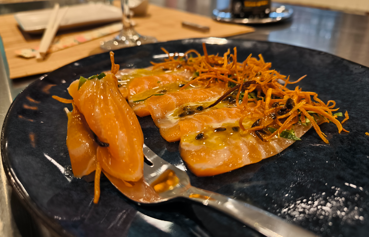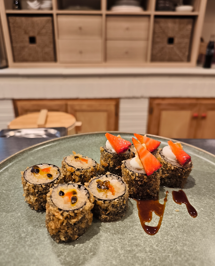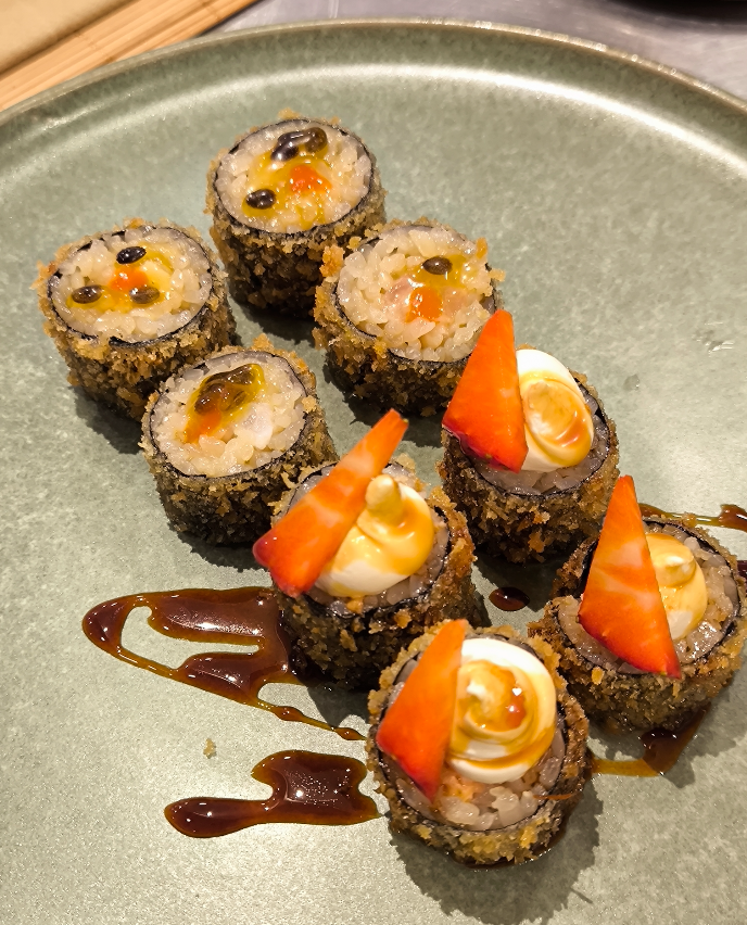 A continuación podrás degustar con la vista algunas piezas que pudimos probar como el tiradito limeño, la maracuyá de salmón… Nos encantó el roll uramaki de salmón, con queso philadelphia, aguacate y semillas de sésamo. De ahí, pasamos al tropical: un roll con mango, ralladura de lima, salsa pasión picante. Parada especial en el sabor del Quisquilloso, un roll hecho con langostinos, pepino, mango, tartar de quisquillas de Motril, sí, kilómetro cero total, y con hilo picante.