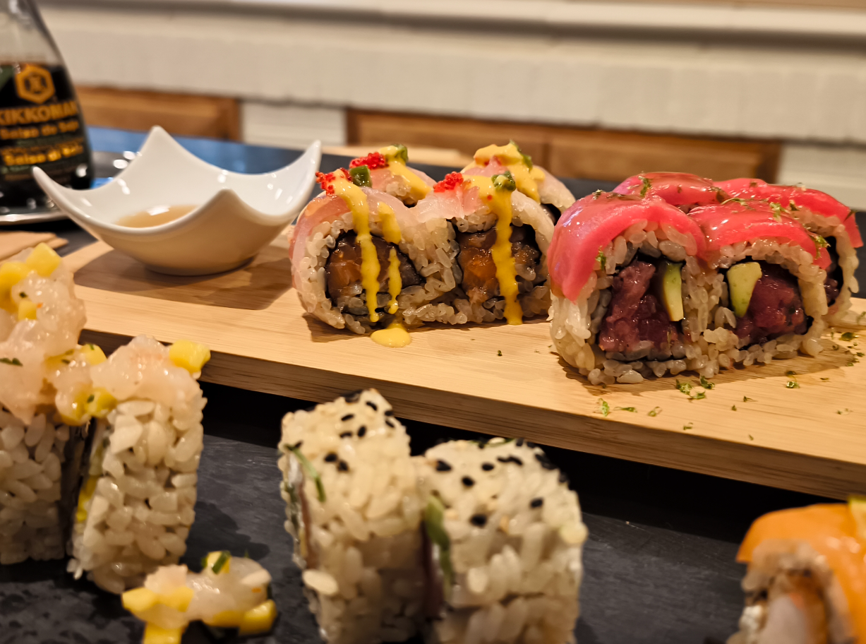 Su carta ofrece una amplia variedad de sushi, y nos propusimos probar un poco de todo. Desde osomakis hasta rolls innovadores, cada pieza estaba elaborada con una meticulosa atención al detalle. Lo que realmente nos sorprendió fue la calidad y la procedencia de los ingredientes: utilizan producto local para sus platos, lo que garantiza frescura y un sabor excepcional. La fusión de técnicas japonesas con la riqueza de los productos de la zona da como resultado un sushi que brilla con luz propia.