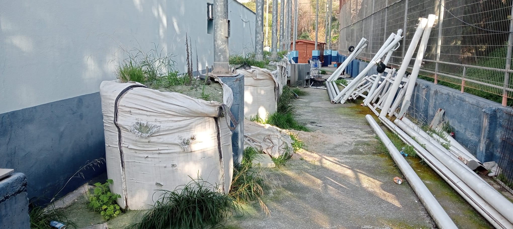 Juan Moreno ha revelado cómo en este recinto, detrás de los vestuarios, se acumulan basuras, muebles viejos, enseres y montones de pequeños trozos de caucho del anterior cambio de césped, algo que contamina y está prohibido almacenar sin control.