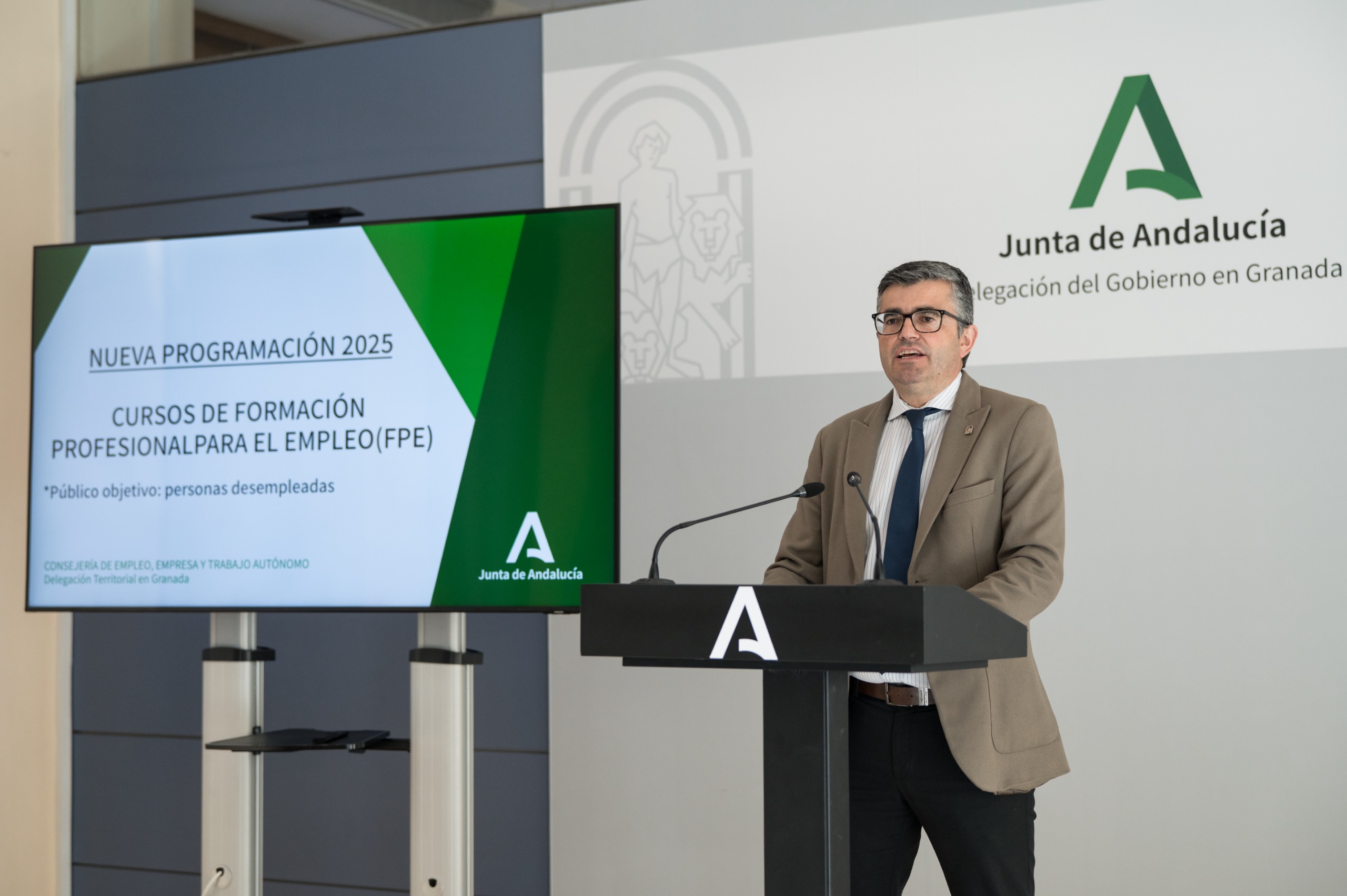 El delegado territorial de Empleo, Empresa y Trabajo Autónomo de la Junta de Andalucía en Granada, Javier Martín Cañizares, ha presentado esta mañana la nueva programación de cursos de Formación Profesional para el Empleo (FPE), la mayor oferta de acciones formativas dirigidas a desempleados de la provincia de la última década. La programación, que se desarrollará durante este año, consta de más de 600 cursos gratuitos, 9.000 plazas y una inversión que supera los 14,5 millones de euros.