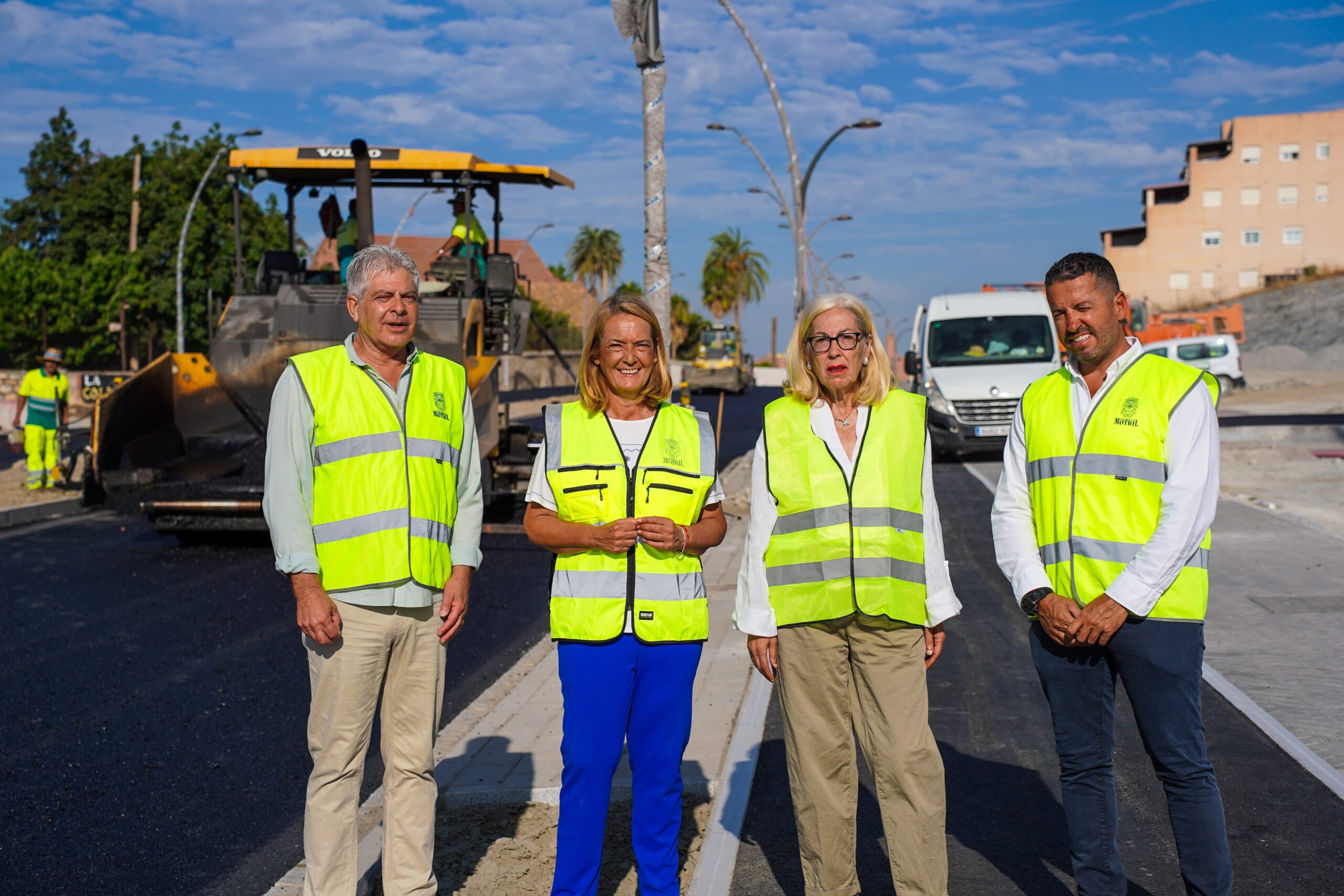 Motril, 24 de julio de 2025. La alcaldesa de Motril, Luisa García Chamorro, junto con el vicepresidente segundo de la Mancomunidad de Municipios de la Costa Tropical, Plácido Lara, la teniente de alcalde de Urbanismo, María Ángeles Escámez, y el concejal de Gestión de Infraestructuras y Obras, José Balderas, han visitado los últimos detalles que se están realizando en las obras del proyecto de construcción de ampliación de la calzada en el Camino de las Ventillas (GR-5209), entre el tramo de la avenida Sierra Nevada y la Plaza de Toros de Motril, en este momento con las tareas de asfaltado de la vía, para anunciar que estas obras estarán finalizadas para el próximo día 2 de agosto, fecha clave para el comienzo del uso de esta vía en el mes de agosto y de cara al inicio de las Fiestas Patronales 2025.