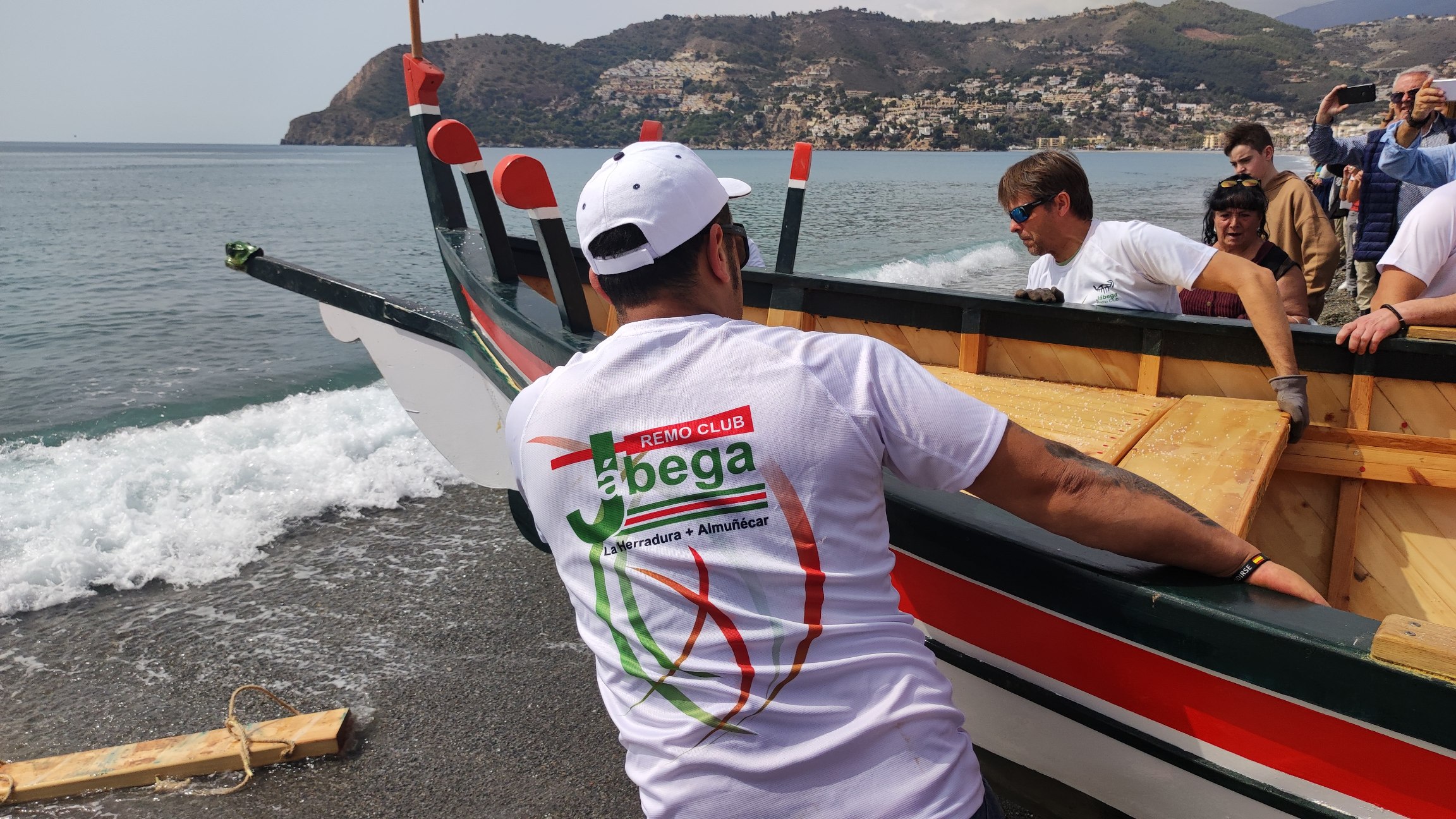 Los parales se alineaban para empujar la barca, de unos 500 kilos, rumbo al agua. Ya en el rebalaje antes de los remeros la que subió a la barca fue Consuelo Barbero. En el agua la embarcación puso rumbo a poniente en la bahía herradureña para que todos plasmaran y admirarán la nueva baca o jábega.