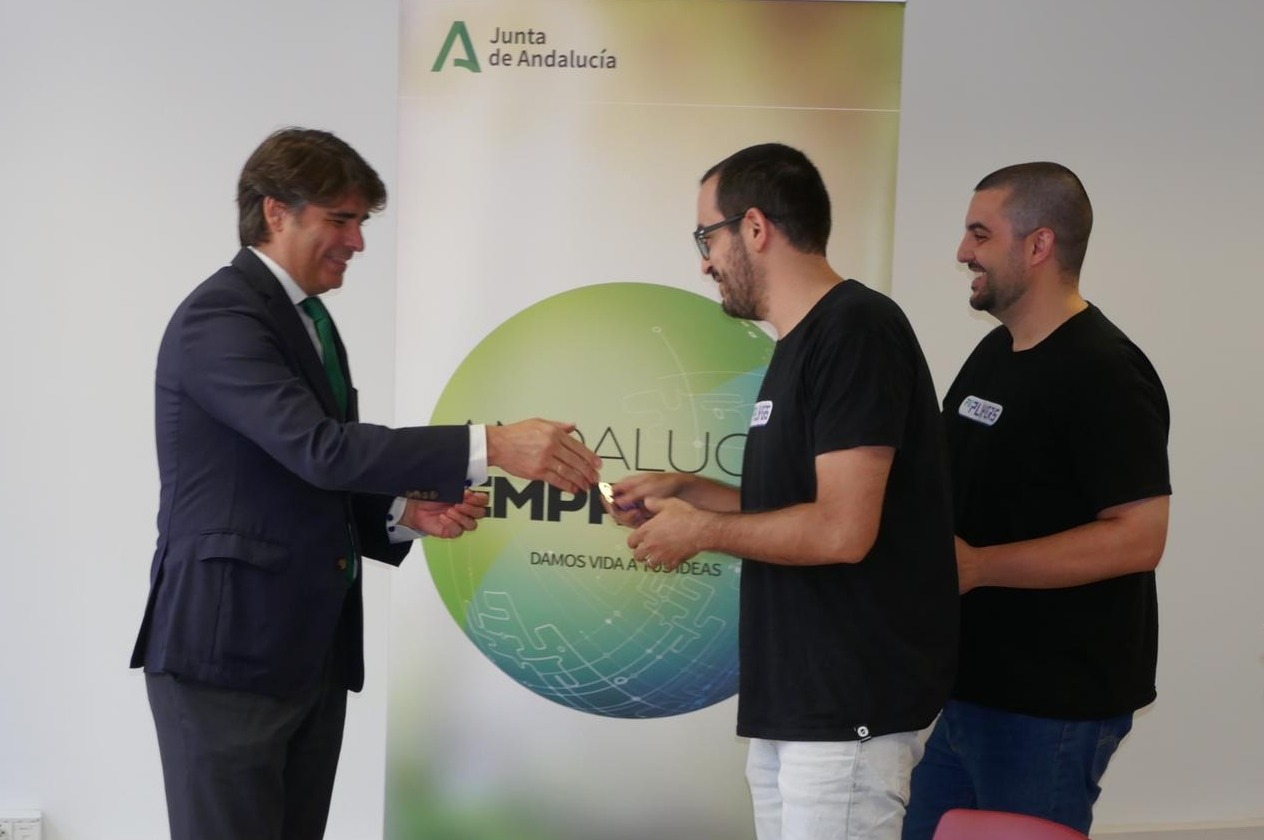 El director general de Andalucía Emprende, fundación adscrita a la Consejería de Universidad, Investigación e Innovación, Daniel Escacena, acompañado de la delegada territorial de Desarrollo Educativo y Formación Profesional y Universidad, Investigación e Innovación en Granada, María José Martín, han entregado hoy las llaves de sus despachos a las cuatro nuevas empresas que recibirán el servicio de alojamiento empresarial en el Centro Andaluz de Emprendimiento (CADE) de Granada.