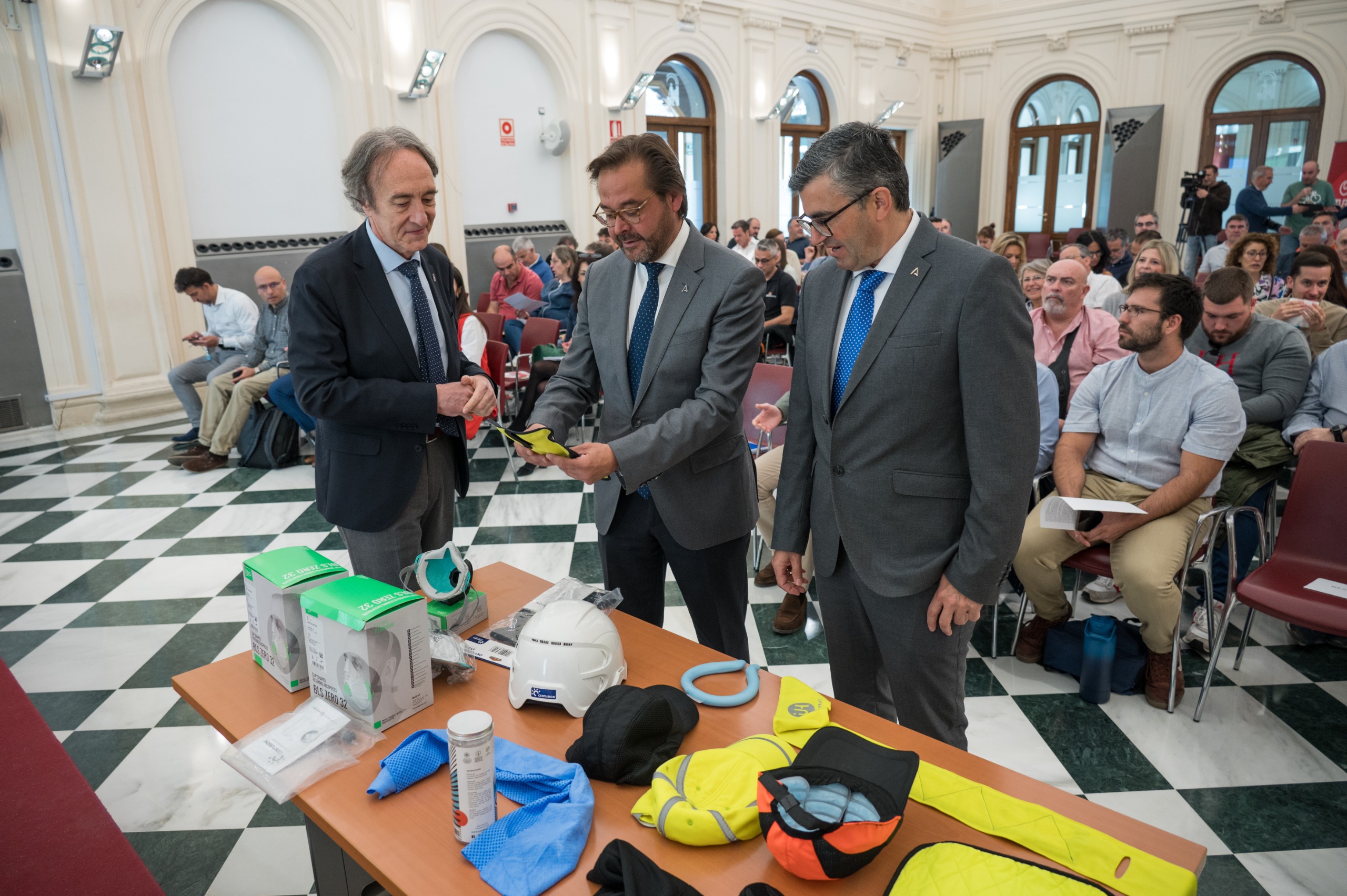El delegado del Gobierno, Antonio Granados, acompañado por el delegado territorial de Empleo, Empresa y Trabajo Autónomo, José Javier Martín, y el delegado territorial de Salud y Consumo, Indalecio Sánchez-Montesinos, ha asistido a la apertura de la Jornada ‘Riesgo de estrés térmico por calor: identificación y evaluación. Medidas de prevención y de protección’, enmarcadas dentro del Plan de Choque Contra la Siniestralidad Laboral en Andalucía, que ha reunido en la sede de la Junta a un centenar de profesionales de la prevención y salud laboral, delegados de prevención, técnicos y responsables de empresas y organizaciones y a trabajadores de actividades expuestas a este riesgo.