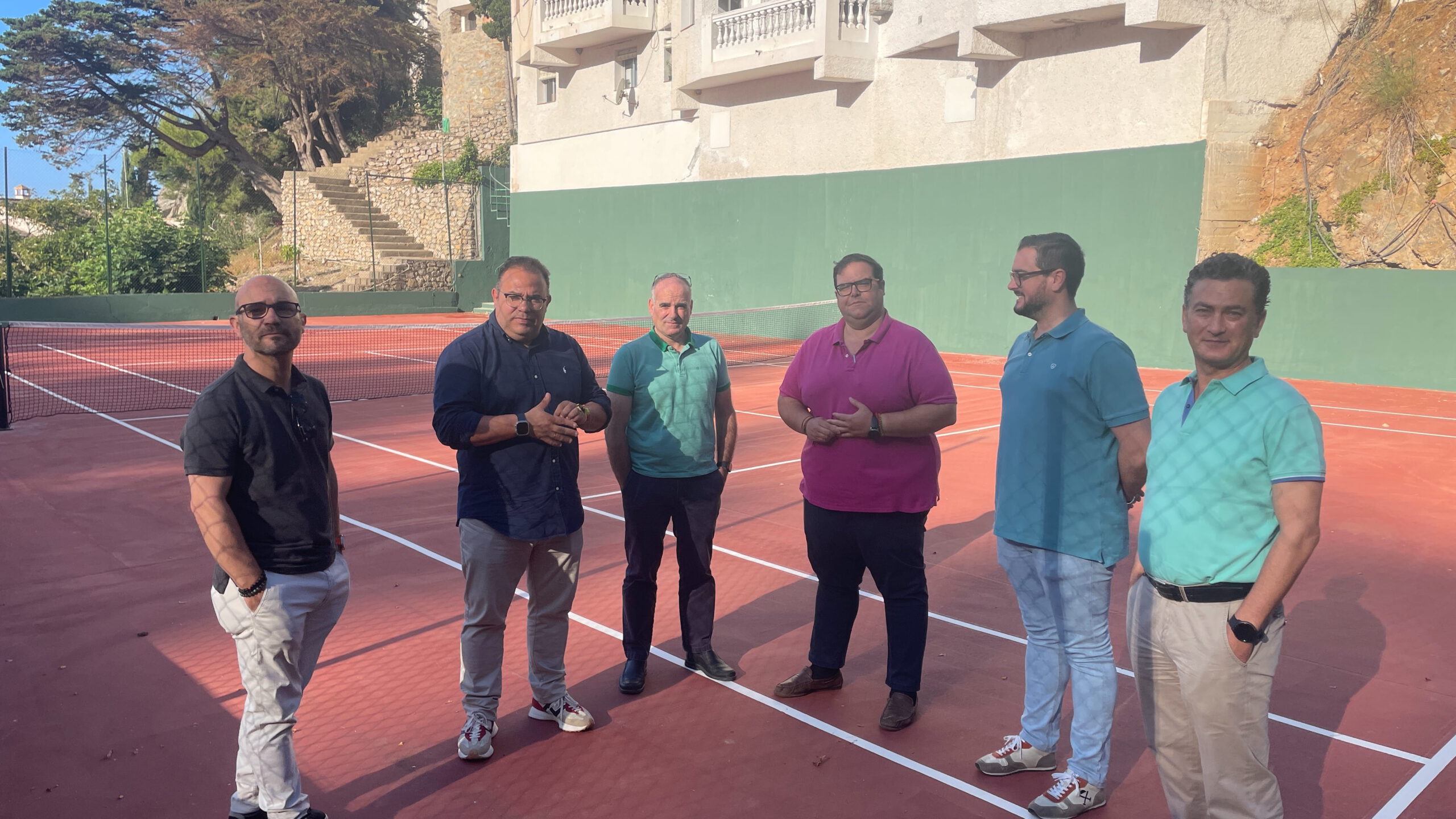 El presidente de la Mancomunidad de la Costa Tropical, Rafael Caballero, y el alcalde de Almuñécar, Juanjo Ruiz Joya, acompañados por el concejal de Obras Públicas, Francisco Rodríguez y el gerente de la empresa concesionaria del ciclo integral del agua, Aguas y Servicios, Alejandro Jurado, han visitado el depósito de Cotobro, para comprobar el final de los trabajos de relleno del vaso y la reposición de la pista deportiva de tenis de la urbanización.
