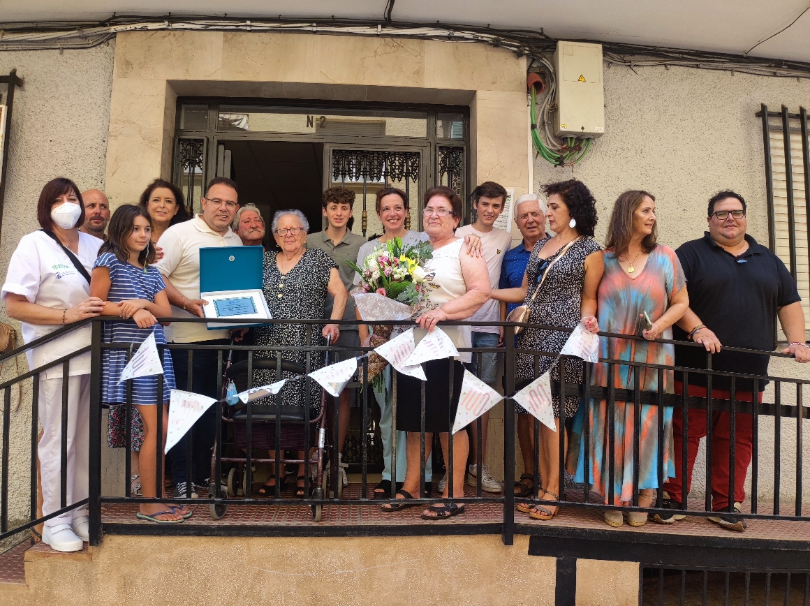 El homenaje ha contado con la presencia del alcalde, Juan José Ruiz Joya, acompañado de la teniente de alcalde, Beatriz González y los ediles de Servicios Sociales y Hacienda, María del Carmen Reinos y Rafael Caballero, respectivamente. “En nombre del Consistorio le hacemos ha hecho entrega de una placa con la que queremos felicitarla y reconocerle su trabajo y esfuerzo en la vida”, dijo el primer edil sexitano, tras cantarles todos los asistentes el cumpleaños feliz al asomarse con su andador el portal del edificio.