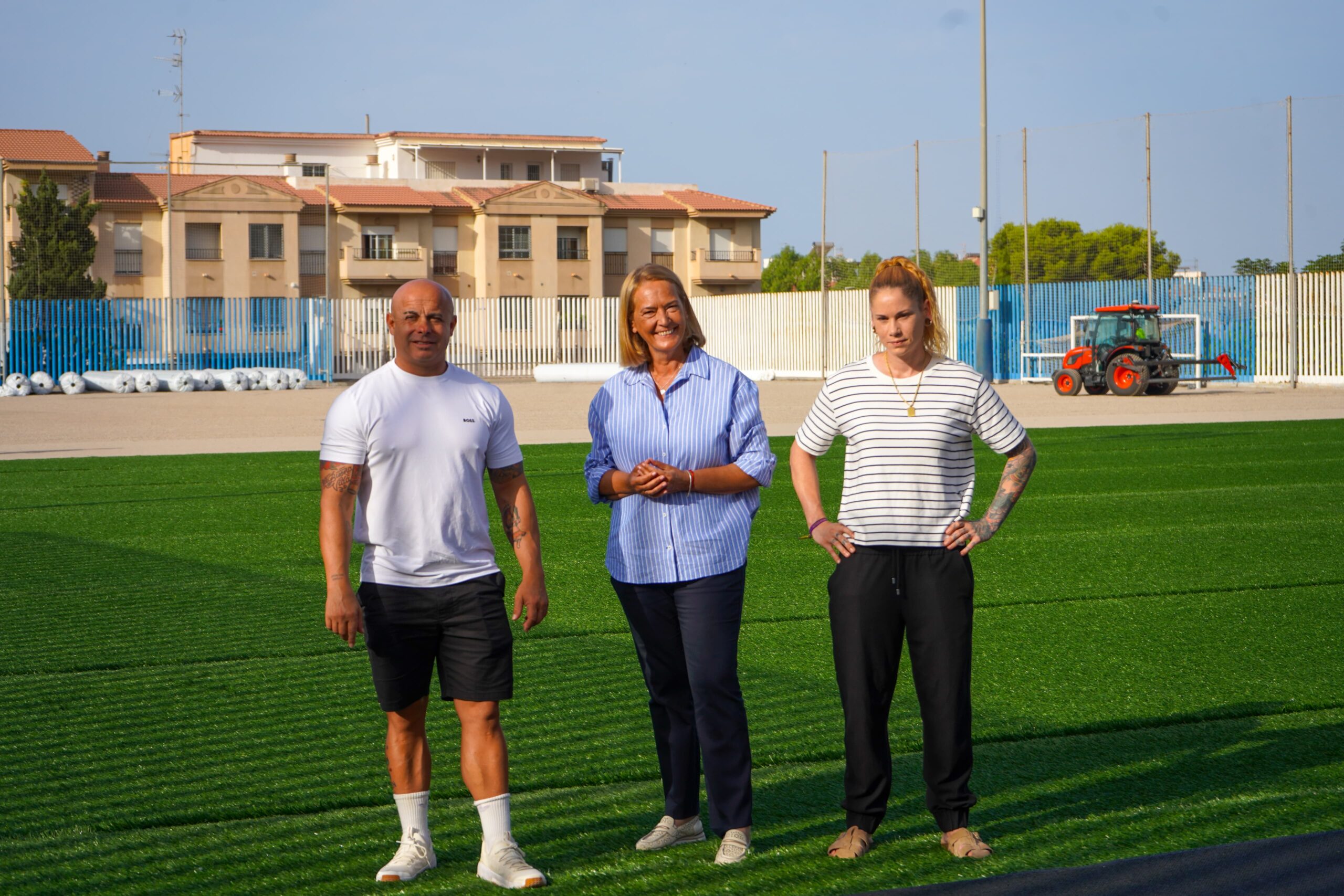 La alcaldesa de Motril, Luisa García Chamorro, acompañada por el teniente de alcalde encargado del área municipal de Deportes, Daniel Ortega, han visitado las instalaciones deportivas municipales del Campo de fútbol “Hermanos Callejón” con motivo de la instalación del césped tras la instauración del sistema de riego, entrando así en la fase final de estas obras, que estiman su apertura de cara a la nueva temporada deportiva.
