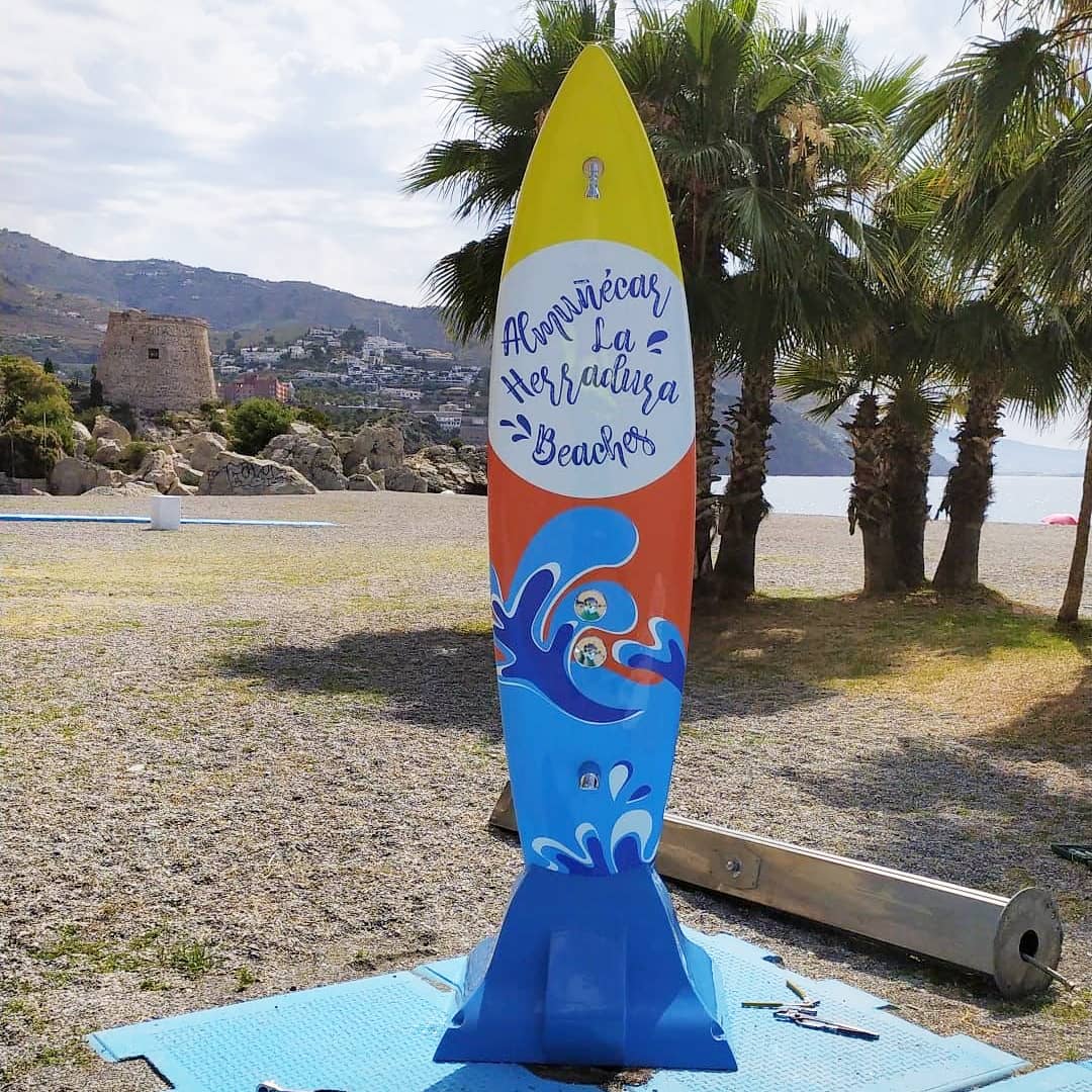 El Ayuntamiento de Almuñécar, a través de la Concejalía de Turismo y Playas, está procediendo estos días a la instalación de cinco duchas de playa con formato de tabla surf y con un colorido distinto, destacando el nombre de «Playas Almuñécar-La Herradura».