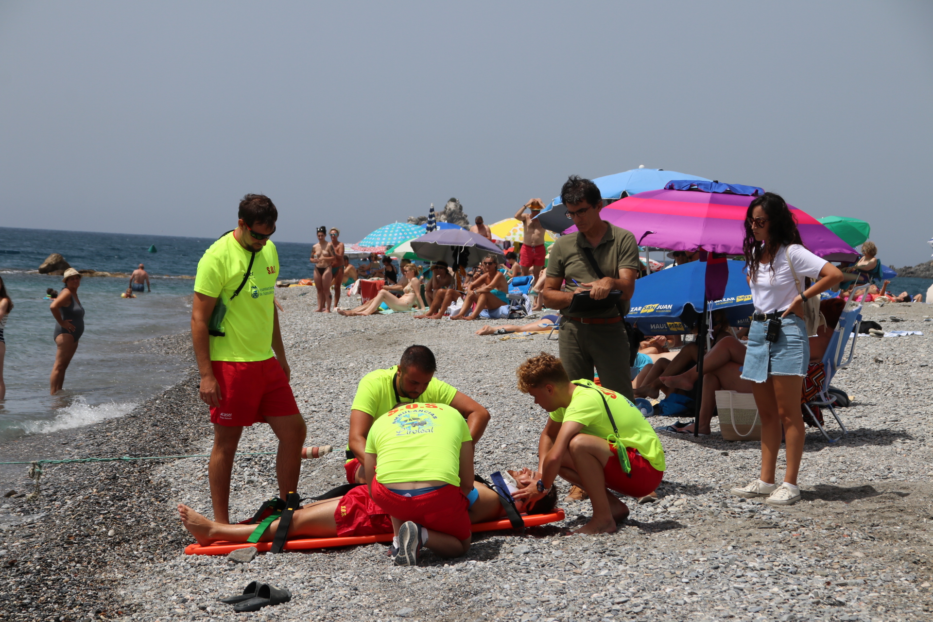 “En las tareas de rescate, que fueron seguidas por el alcalde y responsable de Seguridad, Juan José Ruiz Joya, acompañado del primer teniente de alcalde, Rafael Caballero y la concejala de Playas, Lucía González, fueron cronometradas por los responsables municipales de Seguridad, desde que se dio la voz de alarma hasta que la ambulancia que llevaba al bañista rescatado llegó al Centro de Salud de Almuñécar.