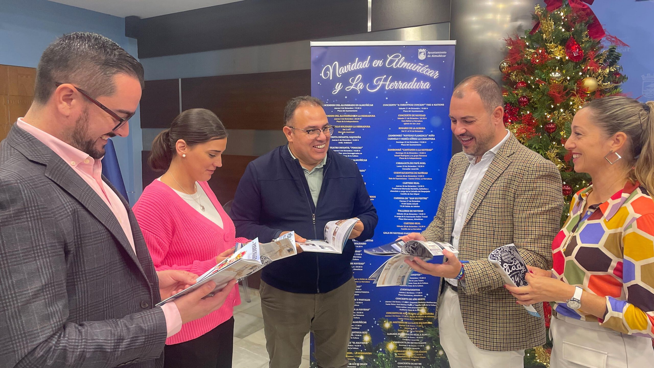 El alcalde de Almuñécar, Juanjo Ruiz Joya, acompañado por los concejales de Cultura y fiestas, Alberto Garbía Gilabert, Juventud, Francisco Rodríguez, y Comercio, Lucía González, ha presentado la programación navideña que para la que se han organizado más de 100 eventos entre los que destaca la cabalgata de Reyes Magos y el encendido navideño.