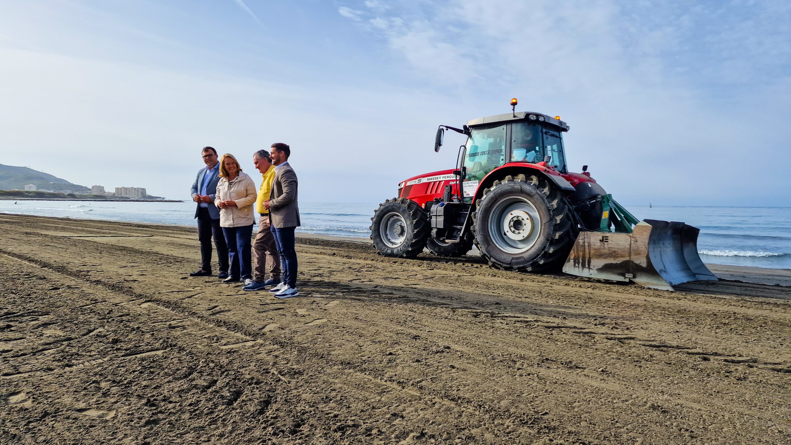 Motril, 27 de junio de 2024. La alcaldesa de Motril, Luisa García Chamorro, junto con el teniente de alcalde de Medio Ambiente, Antonio Escámez, el teniente de alcalde de Calidad Urbana, Juan Fernando Hernández, y el teniente de alcalde de Playas, José Peña, han visitado los trabajos de alisamiento de la arena y limpieza que se están realizando en la Playa de las Azucenas de Motril de cara a la temporada veraniega.