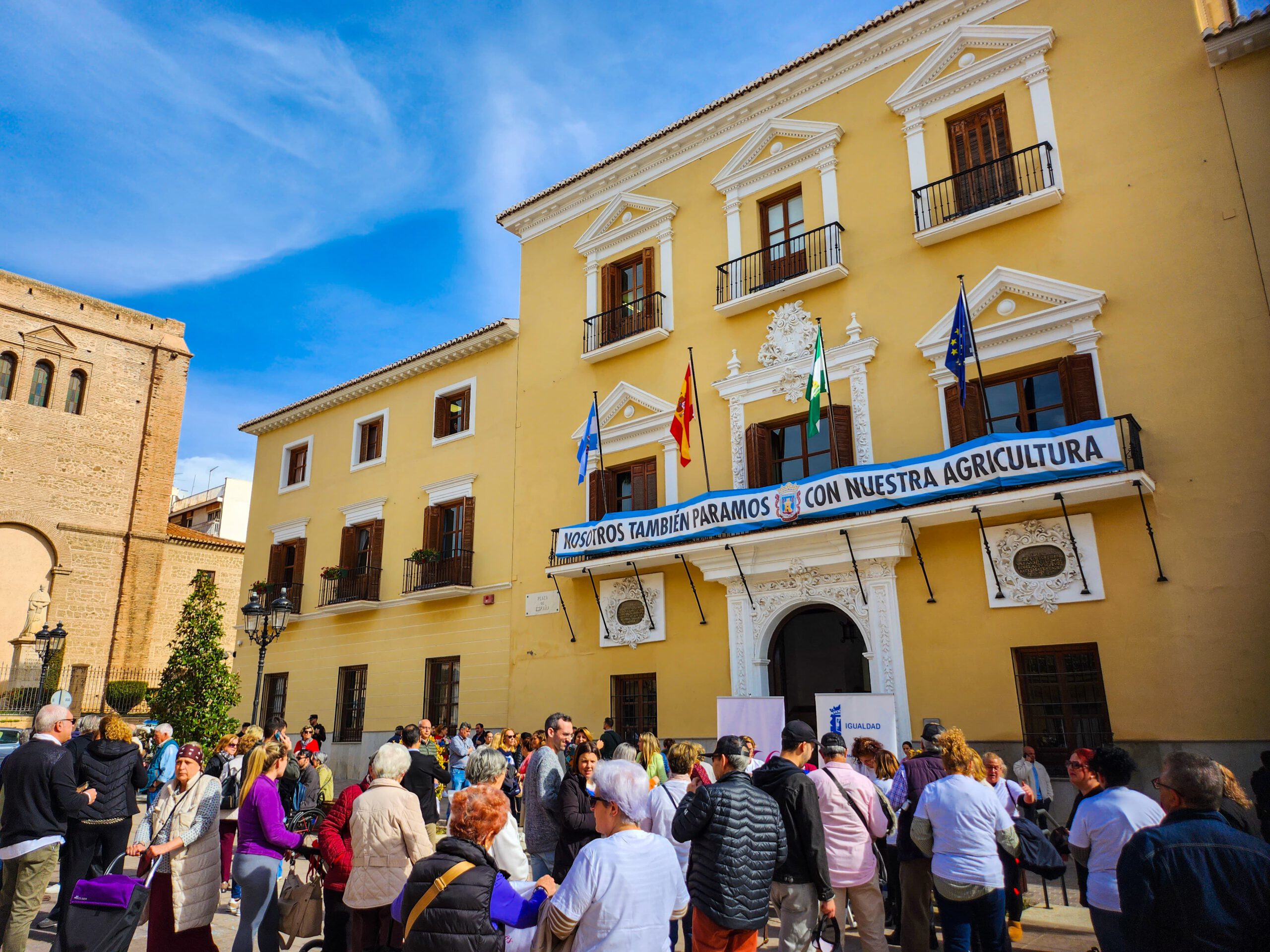 El Ayuntamiento de Motril ha participado activamente en la convocatoria emplazada para la mañana del 14 de febrero en apoyo a la agricultura, sector vital para la economía local de la ciudad. Por ello, miembros del Gobierno municipal y la corporación se han reunido esta mañana a las 12:00 horas en la puerta del Ayuntamiento para mostrar su total apoyo a las reivindicaciones del sector. De hecho, el balcón principal de la casa consistorial cuenta con un cartel con el lema ‘Nosotros también paramos con nuestra agricultura’.