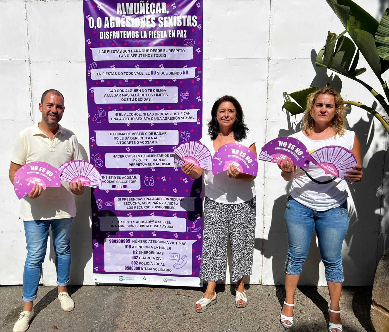 Los concejales de Igualdad y Fiestas Maria Carmen Reinoso Herrero y Alberto García Gilabert, respectivamente, junto a la informadora del Centro de la Mujer, Leticia Fernández han presentado la campaña “Disfrutemos la Fiesta en Paz. Almuñécar 0,0 Agresiones Sexistas”, ante el inicio de las fiestas patronales que comienzan este martes y se prolongarán hasta el lunes día 15 de agosto.