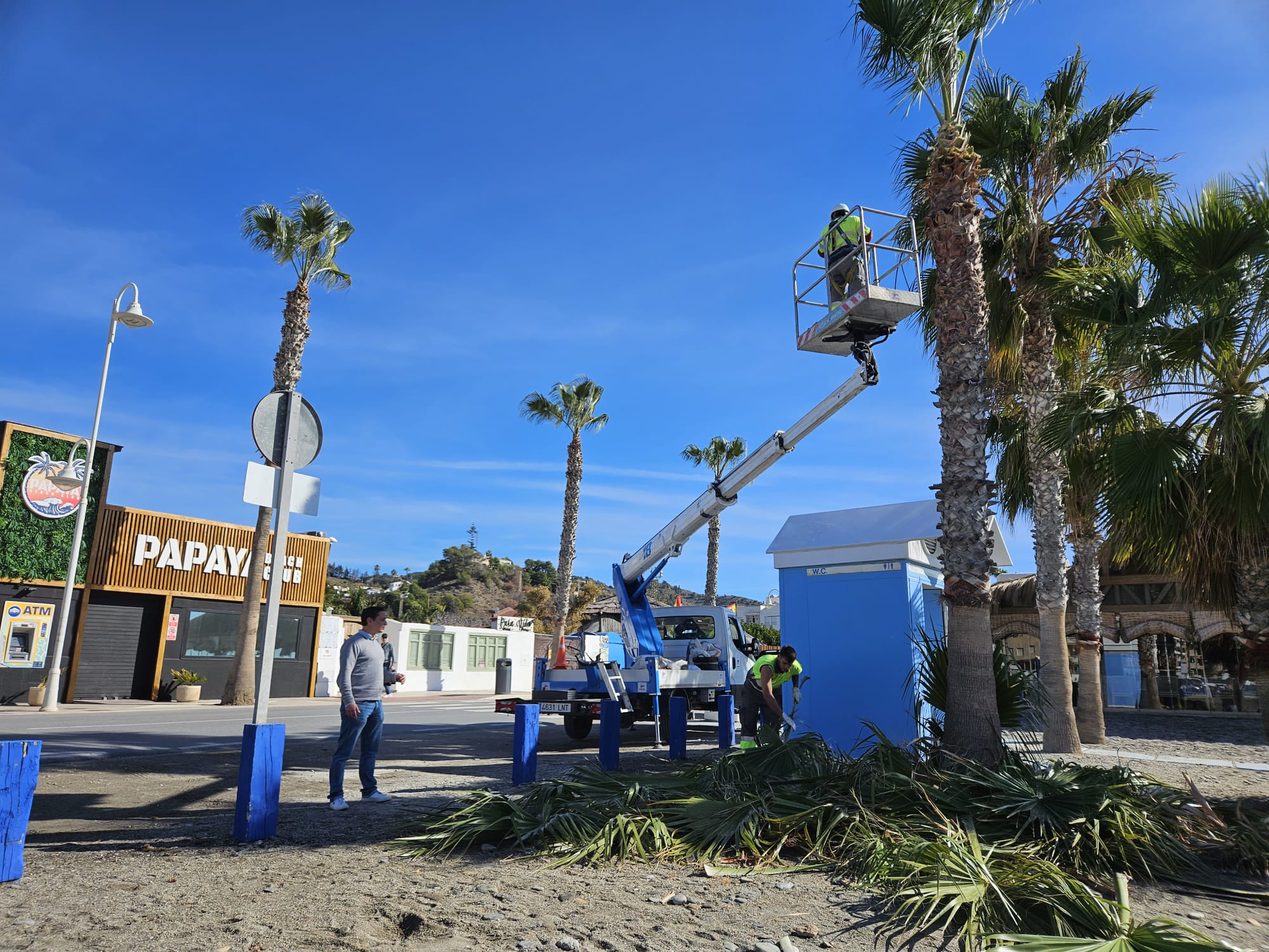 Después de una intensa campaña de limpieza de palmeras por los urbanos de Almuñécar y La Herradura, llega el turno de las palmeras de las playas sexitanas, según ha informado el edil delegado del Área Carlos Ferrón