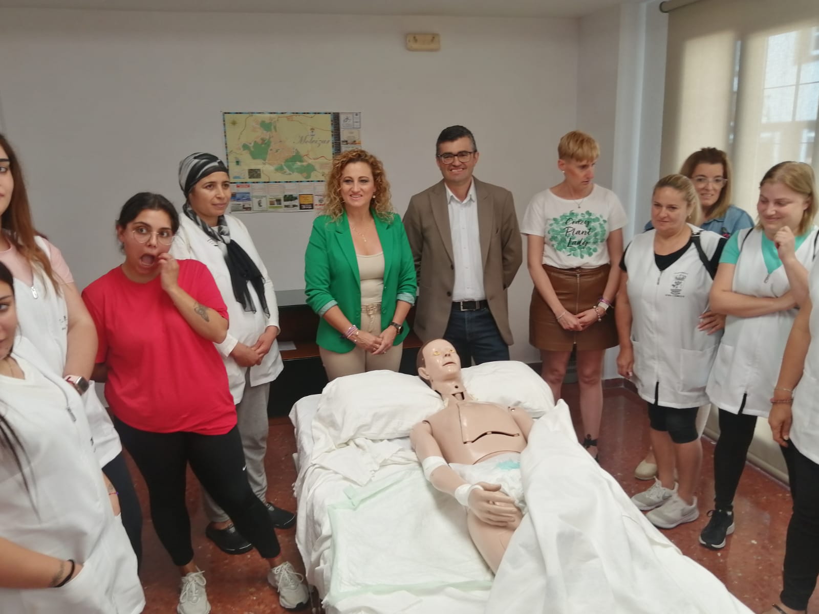 Siendo el principal sector económico la agricultura, centrada en pequeñas explotaciones familiares de subtropicales e invernaderos, la atención sociosanitaria se ha convertido en la segunda fuente de generación de empleo de la localidad. Con un total de 2.731 habitantes, 764 tienen más de 65 años y 90 de ellos son usuarios del servicio de ayuda a domicilio, que cuenta con una plantilla de 17 auxiliares y una bolsa para cubrir las vacantes. “Con ella solemos atender todas las necesidades tanto del personal como de los usuarios pero siempre nos hace falta más trabajadores puesto que la demanda del servicio va en aumento”, ha explicado la alcaldesa. El Consistorio cuenta además con un programa de atención a mayores “que solemos desempeñar a través de un PFEA especial y que nos sirve para atender sus necesidades mientras se les resuelven sus expedientes de dependencia”, un servicio público complementario donde también pueden encontrar una salida profesional las alumnas del curso de FPE que culmina hoy.