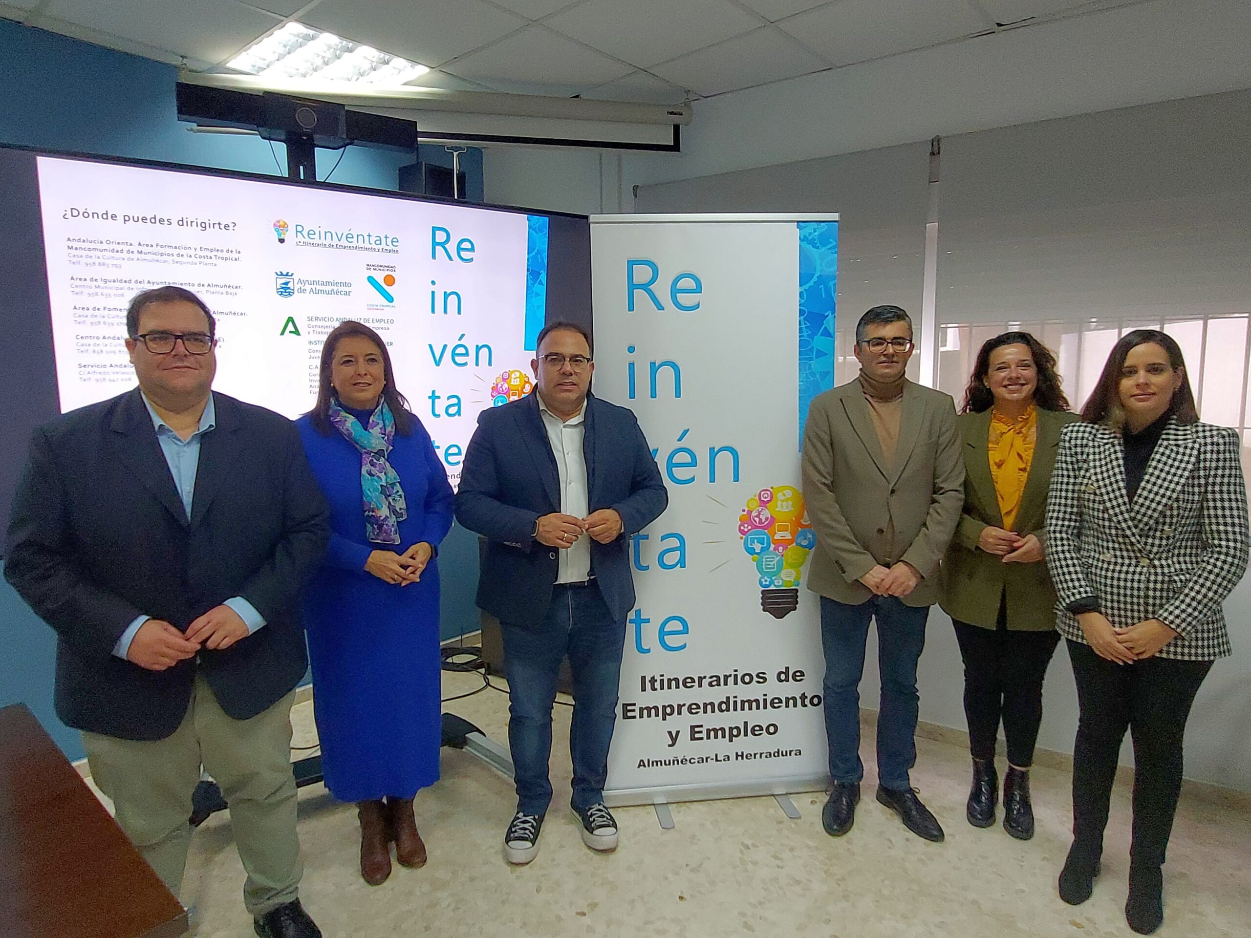 El alcalde de Almuñécar, Juan José Ruiz Joya, junto al delegado de empleo de la Junta de Andalucía, José Javier Martín y el presidente de la Mancomunidad de Municipios de la Costa Tropical, Rafael Caballero, ha presentado la 5ª edición del programa “Reinvéntate”, cuyo objetivo es la inserción laboral de personas en situación de desempleo, por cuenta propia o ajena, mediante la información, la formación, el asesoramiento individual y grupal, y preparándolos en la adquisición de habilidades como la orientación o las nuevas tecnologías.