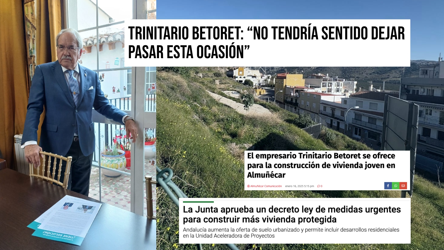 El empresario Trinitario Betoret conoció Almuñécar de casualidad durante su viaje de novios en 1968. Desde entonces, ha apostado por la localidad con diversos proyectos de vivienda joven o complejos hoteleros. Hoy charlamos con Trinitario, cuya cualidad más destacada es sin duda la paciencia. En 1999 compró una gran finca para construir su Hotel Cortejo Andalucía. La administración lo detuvo cuando estaba próximo a su terminación y aún guarda la esperanza de verlo acabado y en funcionamiento. Ahora, en 2025 y con el drama de la vivienda en aumento, ofrece otros terrenos para construir 40 viviendas