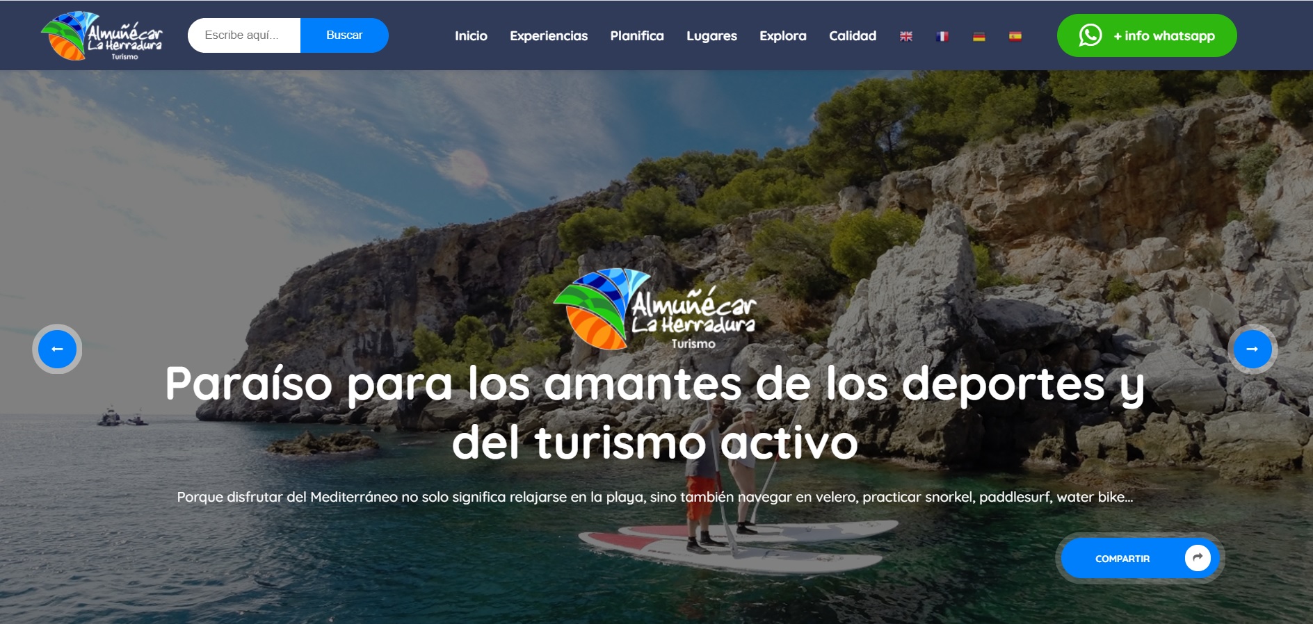 Esta es una nueva página adaptada a las nuevas plataformas móviles. Tiene opción de selección de idioma. Entre las muchas opciones recoge los puntos de inmersión en buceo, opción de contactar por whatsapp, experiencias que se pueden hacer: turismo cicloturismo, gastronomía, turismo activo, ocio nocturno, cultura… A ello se suma la geolocalización de los lugares culturales, playas, lugares de interés, con una foto incluida y una descripción de los servicios de la playa, diferentes certificaciones, el tiempo que hay durante la semana y vídeos. Por otro lado, desde la opción de planificar, el visitante puede tener acceso a los folletos digitalizados y adaptados a la versión web.