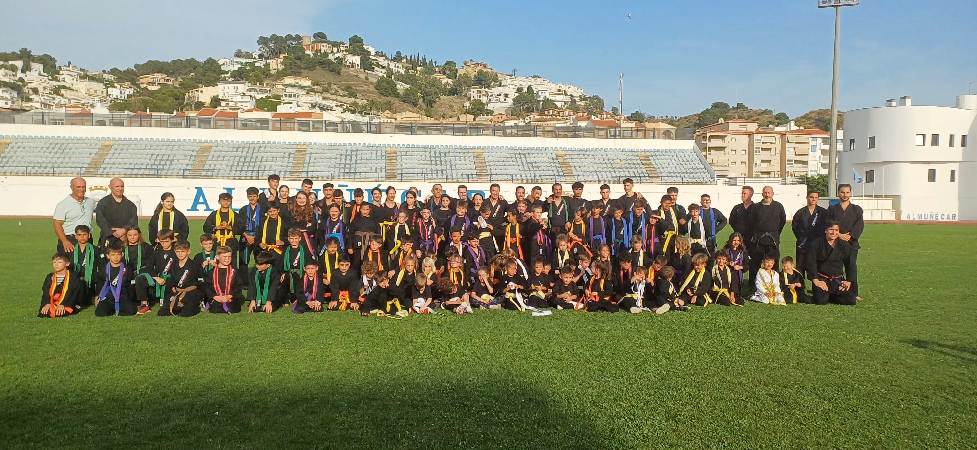La Escuela Municipal de Kenpo de Almuñécar celebró el acto de clausura de la temporada 2024/2025 con la participación de un centenar de alumnos en el campo de fútbol del Estadio Municipal de Deportes ‘Francisco Bonet’. El evento incluyó la tradicional entrega de cinturones y diplomas, así como una exhibición en la que el alumnado demostró lo aprendido a lo largo del año. Familiares y amigos acompañaron al equipo técnico en esta jornada, en la que también estuvo presente el concejal de Deportes, Luis Aragón.
