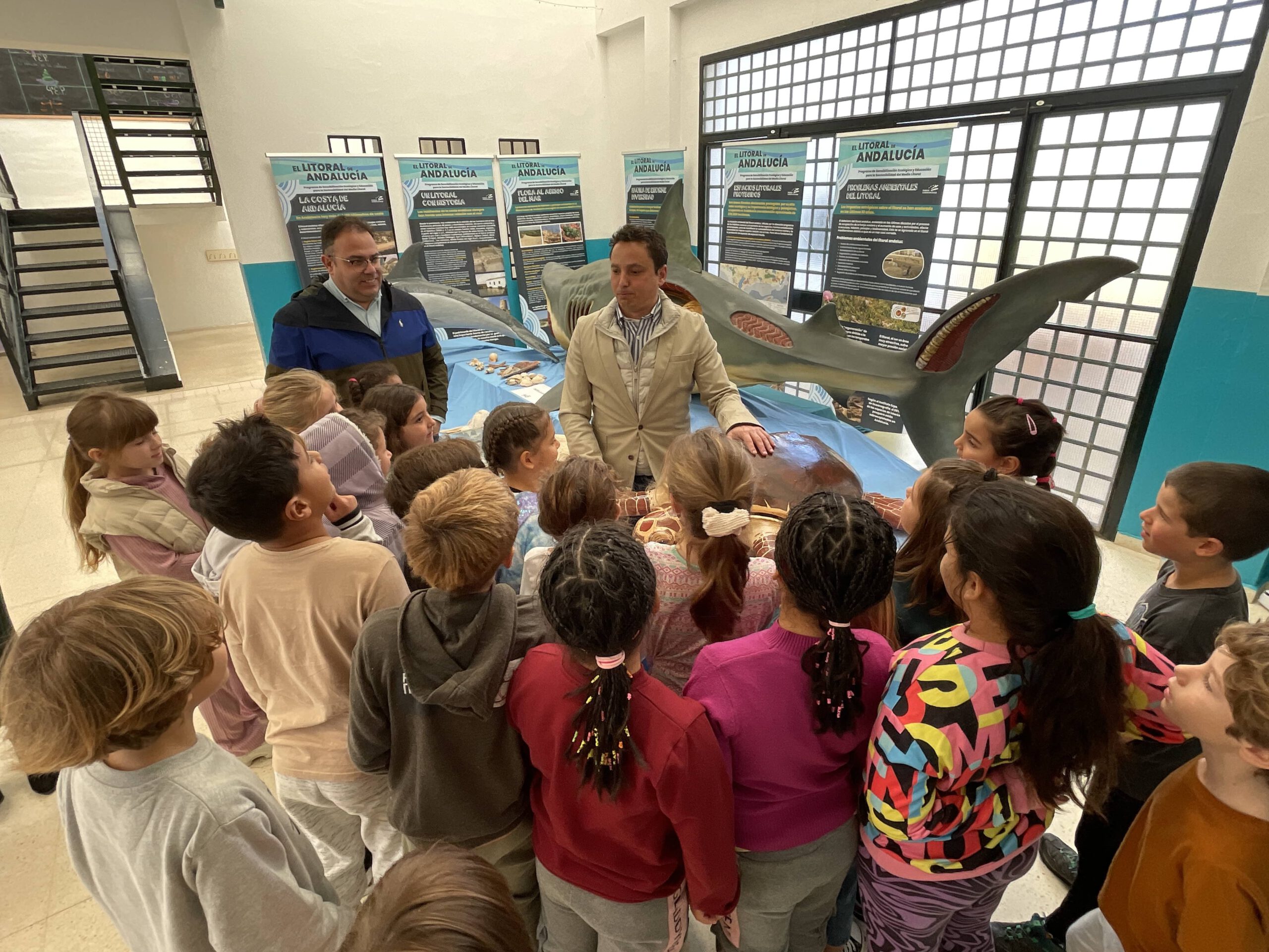 El alcalde de Almuñécar, Juanjo Ruiz Joya y los concejales de Sostenibilidad y Medio Ambiente, Carlos Ferrón y Lucía González, han visitado la exposición que, sobre el litoral marino de la costa tropical, se ha instalado en el Colegio de Educación Infantil y Primaria La Noria.