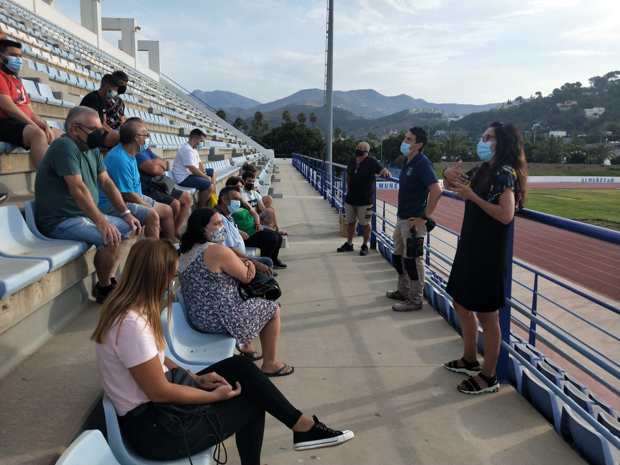 En el acto de bienvenida, que ha tenido lugar en la grada del estadio municipal como medida preventiva ante la pandemia, han participado los técnicos de Formación y Empleo, junto con los monitores de las dos áreas.